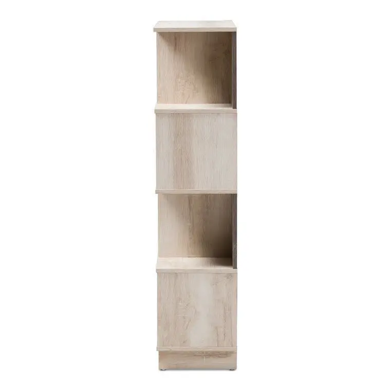 - This bookcase makes it easy to imagine countless possibilities for display and organization. The modern and contemporary-inspired design incorporates rustic elements into its staggered, geometric layout. This bookcase is finished in weathered, light oak, contrasted with the back panels of the closed display compartments in a weathered brown.