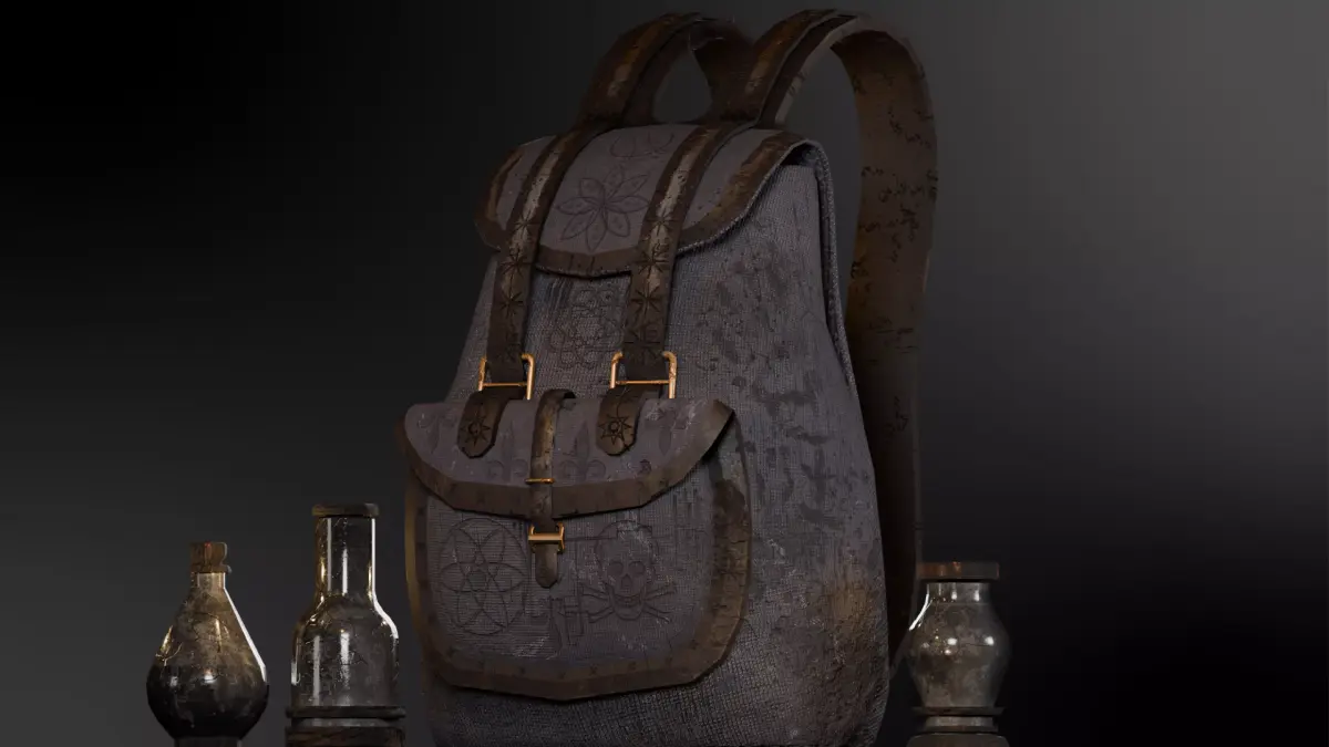 A clean, optimized 3D asset pack featuring a stylized fantasy backpack with potion vials and books.