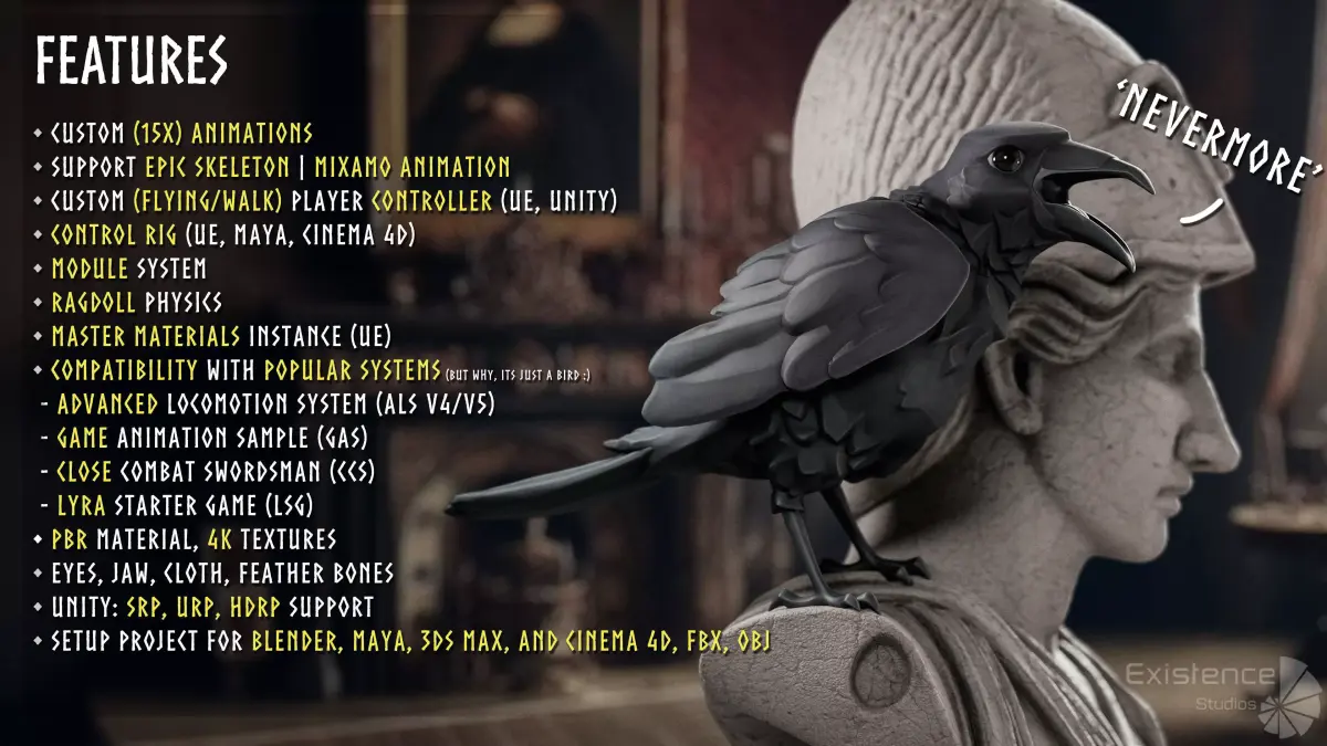 - Detailed Characters: the Raven include a mouth (with tongue) and eyes. All elements are rigged for animation via bones.