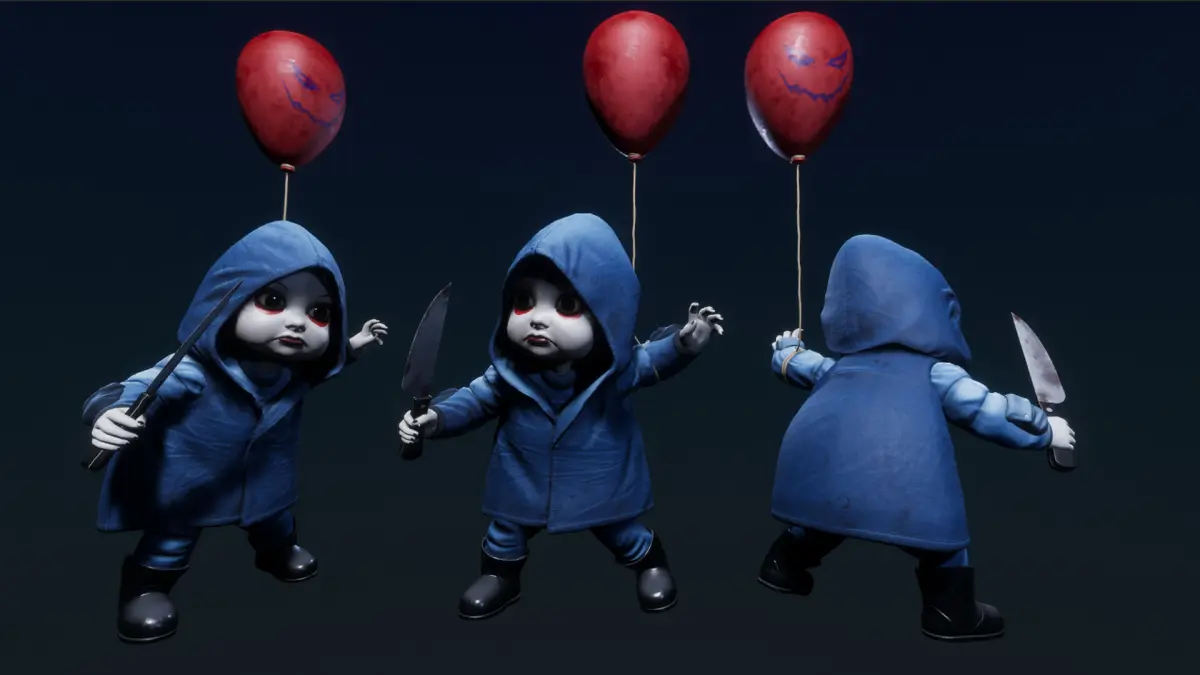 The asset includes customizable procedural blood and color materials, 4K textures, LODs, and collisions (Unreal). The puppet mesh has 41,940 triangles and 23,893 vertices, with optimized materials: 2 master and 6 instances. Accessories include a bloodied knife (600 tris, 2K textures) and a creepy balloon (2,961 tris, 4K textures), both fully integrated with LODs.