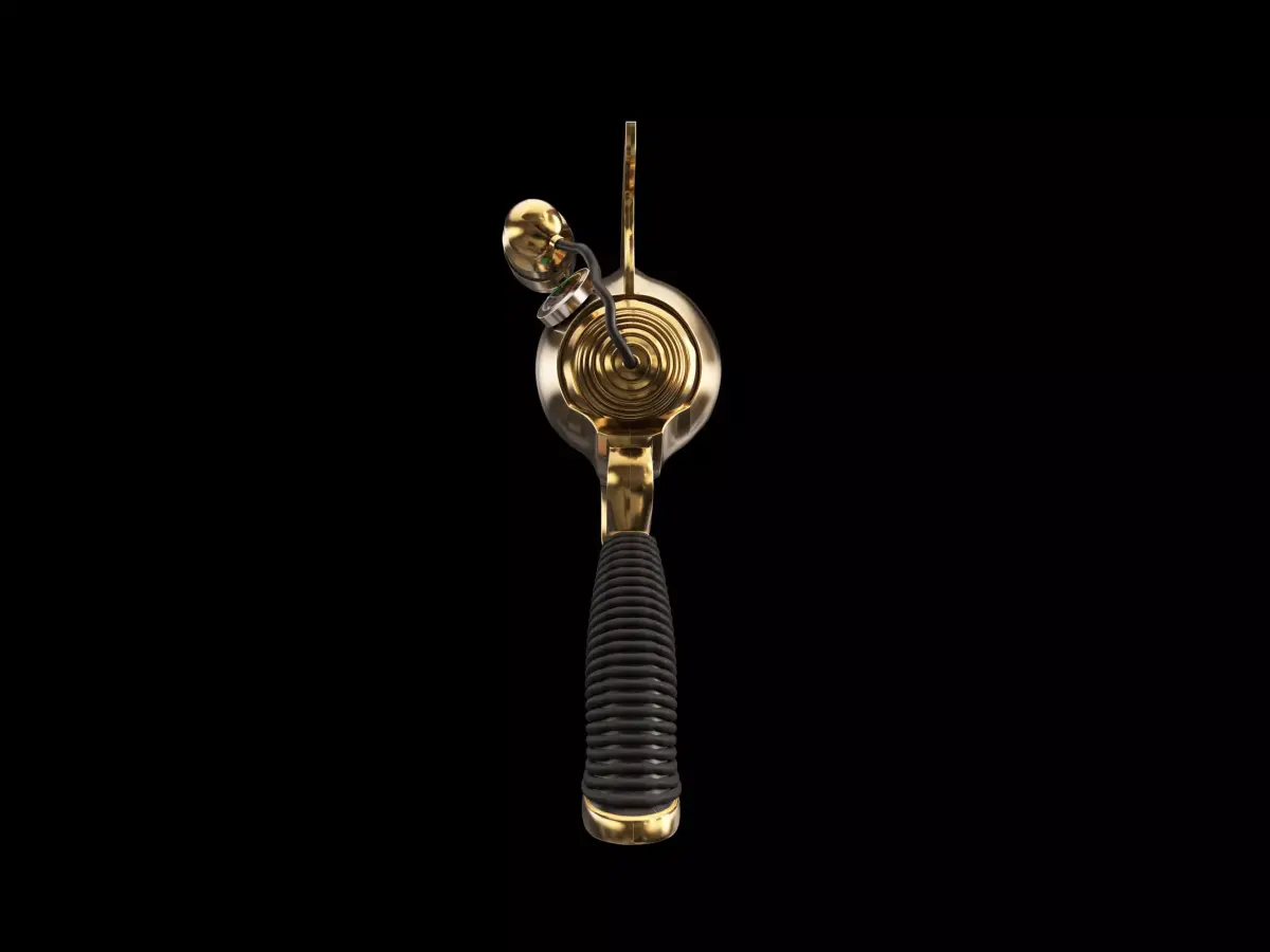 Stylized retro-futuristic ray gun inspired by classic 1950s pulp science-fiction design. Featuring a polished brass body, ribbed grip, and a glass energy chamber with a visible coiled core, this model blends vintage craftsmanship with space-age aesthetics. Suitable for close-ups, cinematic renders, product shots, collectibles, concept art, and stylized sci-fi or steampunk scenes.
