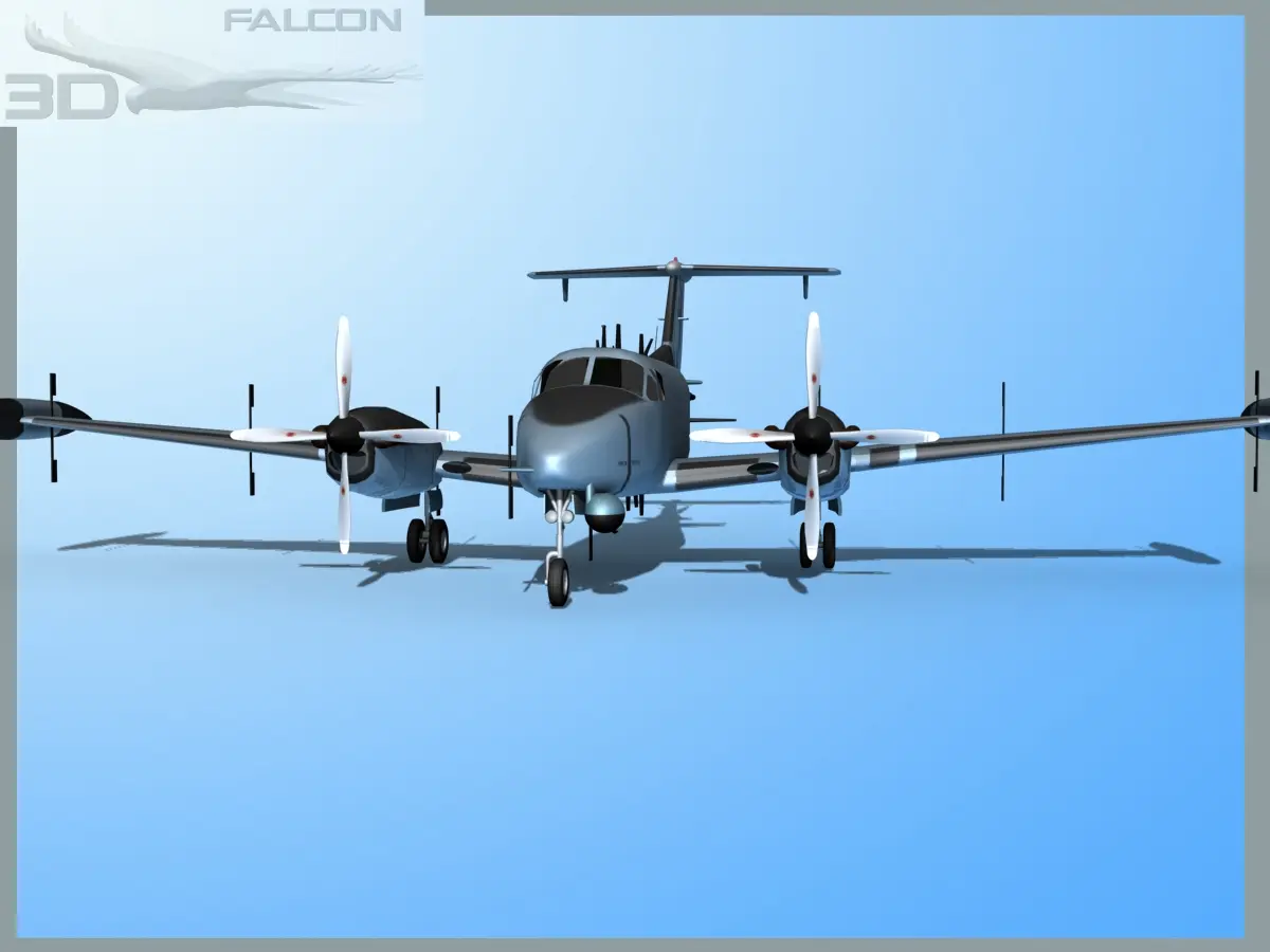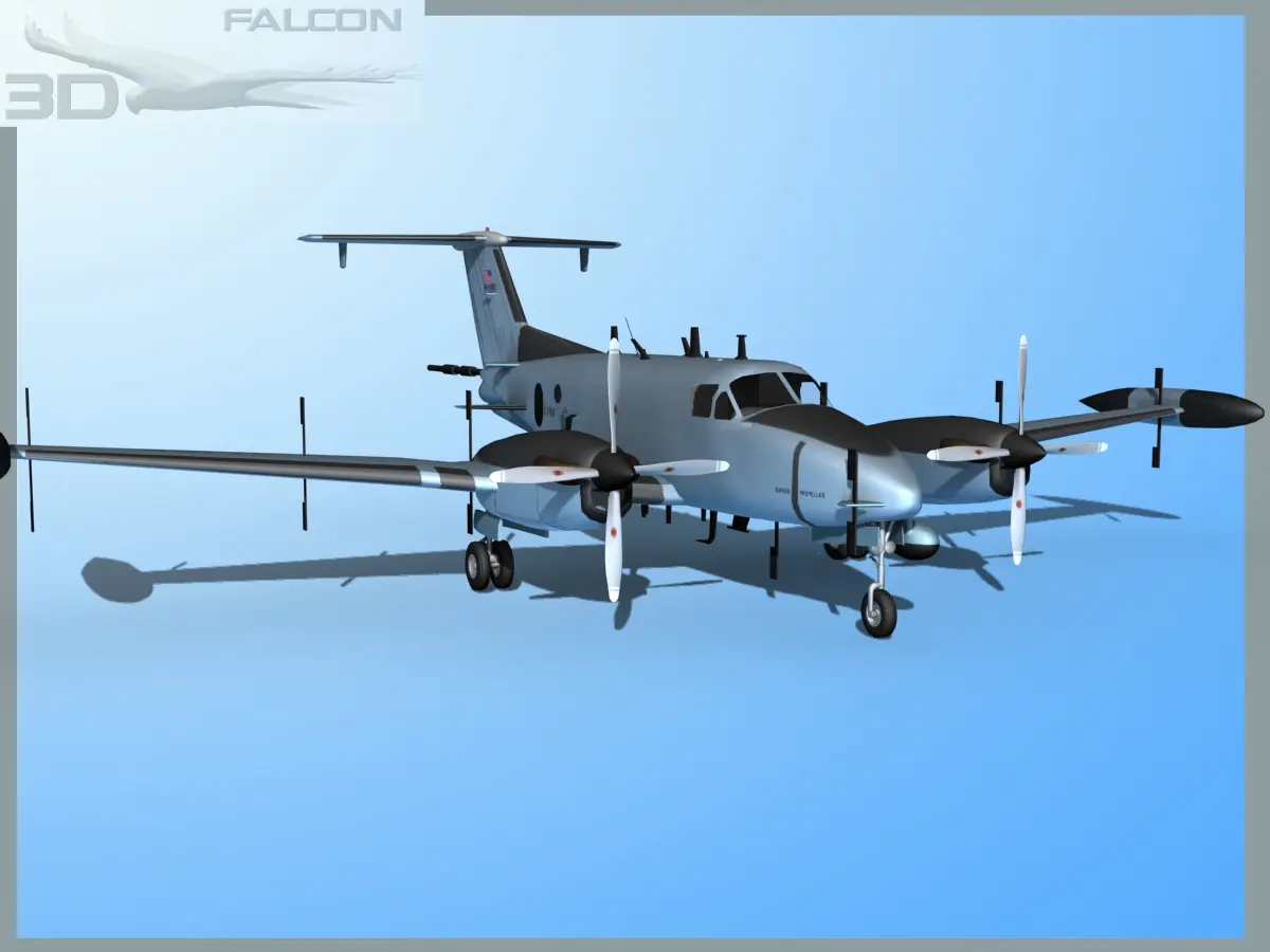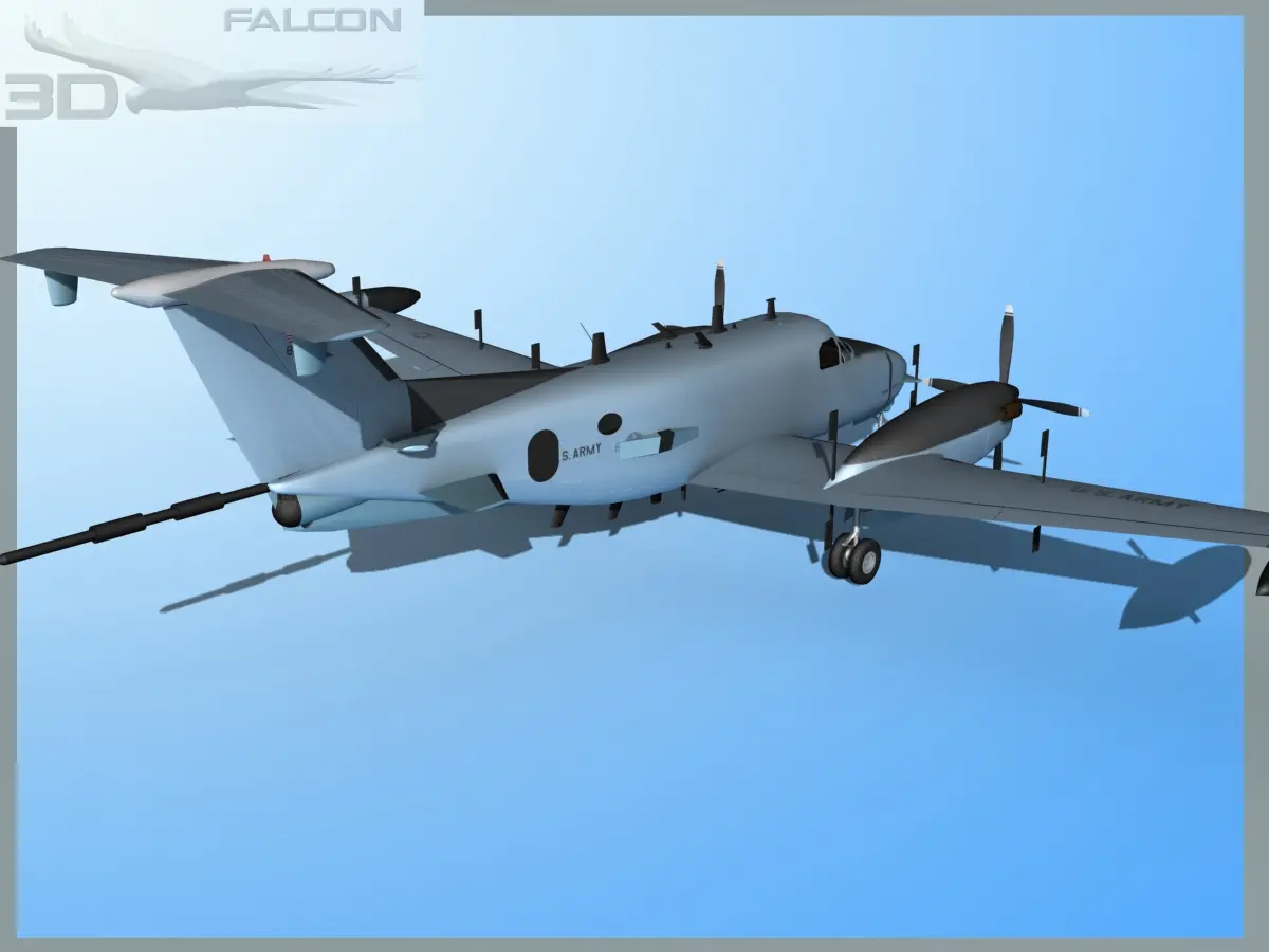 These models are built near to scale and fully textured. They are externallydetailed and include many animateable features. These include landing gear, landing gear doors, propellers, ailerons, flaps, elevators, and rudder. T These models are provided in multiple formats.The RC-12D model being the first of the series, they have been developed through several versions to this model the RC-12P and beyond. This aircraft the RC-12P was most different from the RC-12K. It is also is equipped with dual EFIS,ASE/ACS avionics systems. These began service in 1992-1993 and were based out of Hunter AFB in Georgia. These aircraft are used to gather intelligence through ectronic signals and relay. They are used to monitor enemy radio and other electronic transmission and signals.