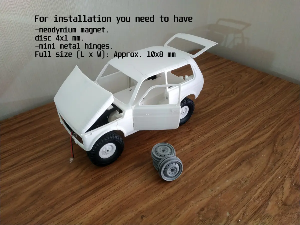 For installation you need to have-neodymium magnet. disc 4x1 mm.-mini metal hinges. Full size (L x W): Approx. 10x8 mm