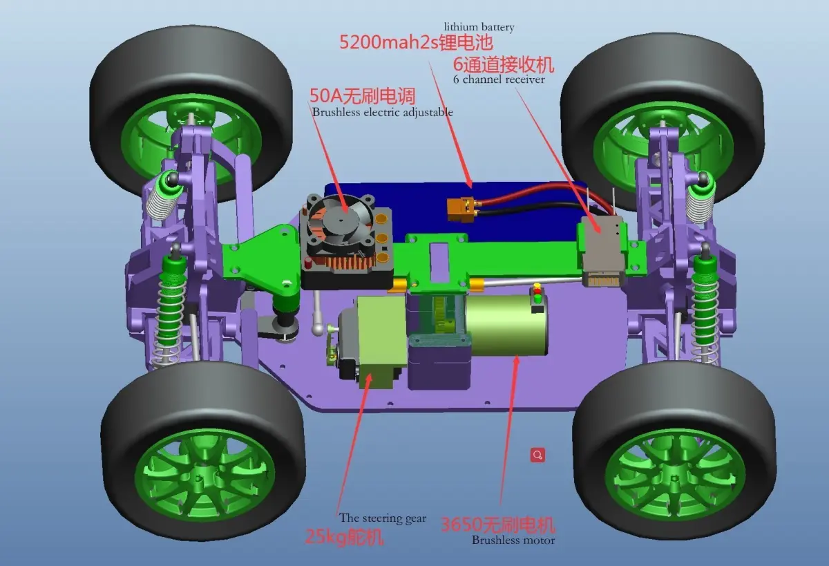 This is a 1:10 RC Bigfoot model car with a wheelbase of 278mm and a width of 300mm. Front and rear suspension with differential, using four wheel independent suspension and four wheel drive design. The motor is 3650 brushless motor, equipped with 60A brushless motor, equipped with 2S lithium battery, the maximum speed can reach 60km/h, of course, through 3S battery or by changing the traditional ratio to achieve greater speed or greater torque, welcome RC Moyo-yi learning!