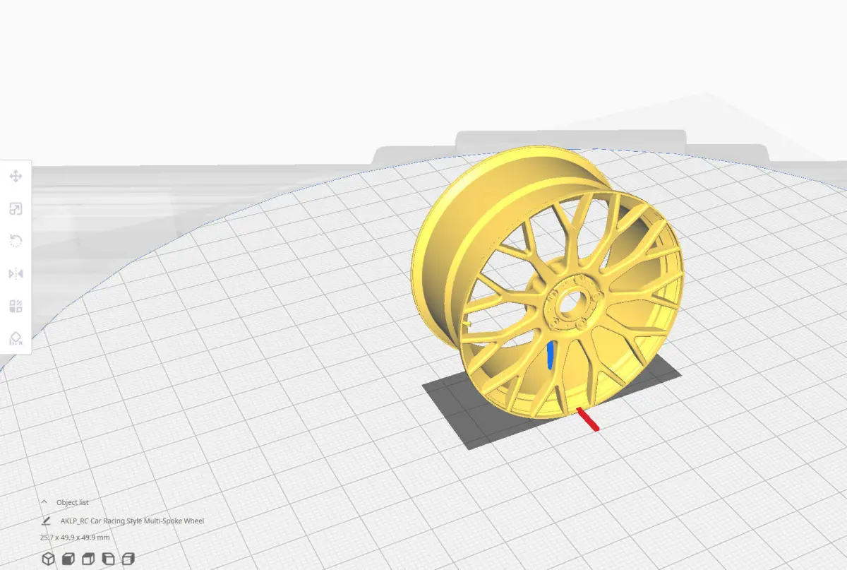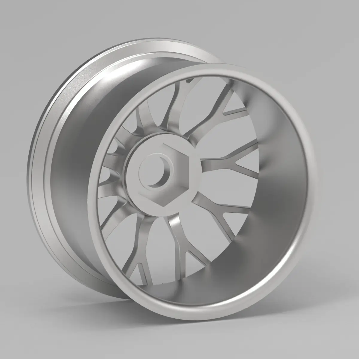 This 3D model features a racing-style multi-spoke wheel designed for RC (radio-controlled) cars. It combines aesthetic appeal with structural functionality, making it ideal for both display and functional use. The geometry is optimized for 3D printing with either resin or filament. It includes a realistic center hub, valve stem detail, and is compatible with standard 12 mm hex mounts used in most 1:10 scale RC cars.