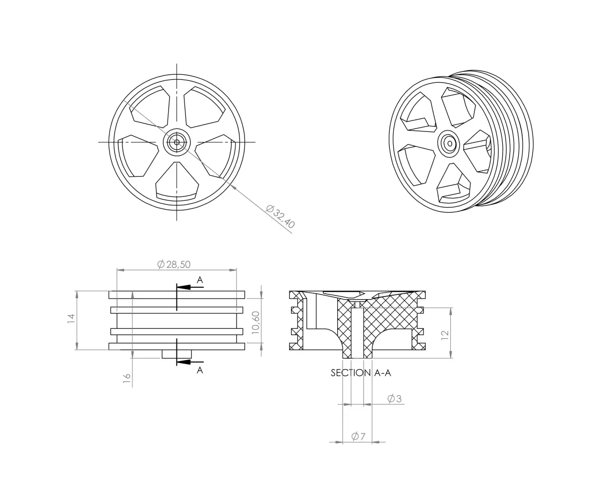 Model was made to be orerobust than original factory wheel.Average weight of a printed model 2-3 grams.Dimmensions are in milimeters (mm).