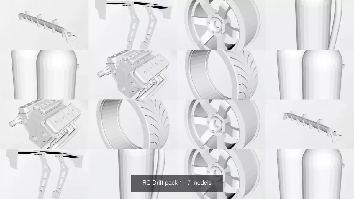 A collection of different drift parts for 1/10 scale drift cars