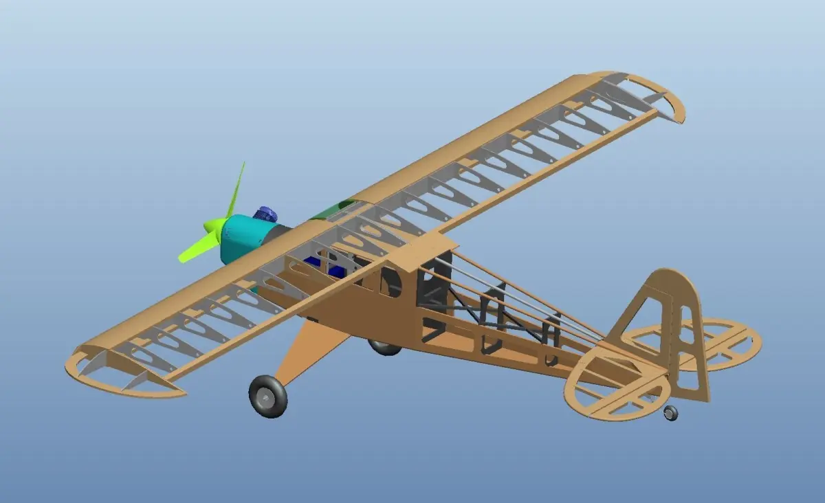This is a model of a fixed-wing model aircraft. The power source of the model aircraft is methanol engine in the head of the aircraft. The model structure is an integral frame structure.