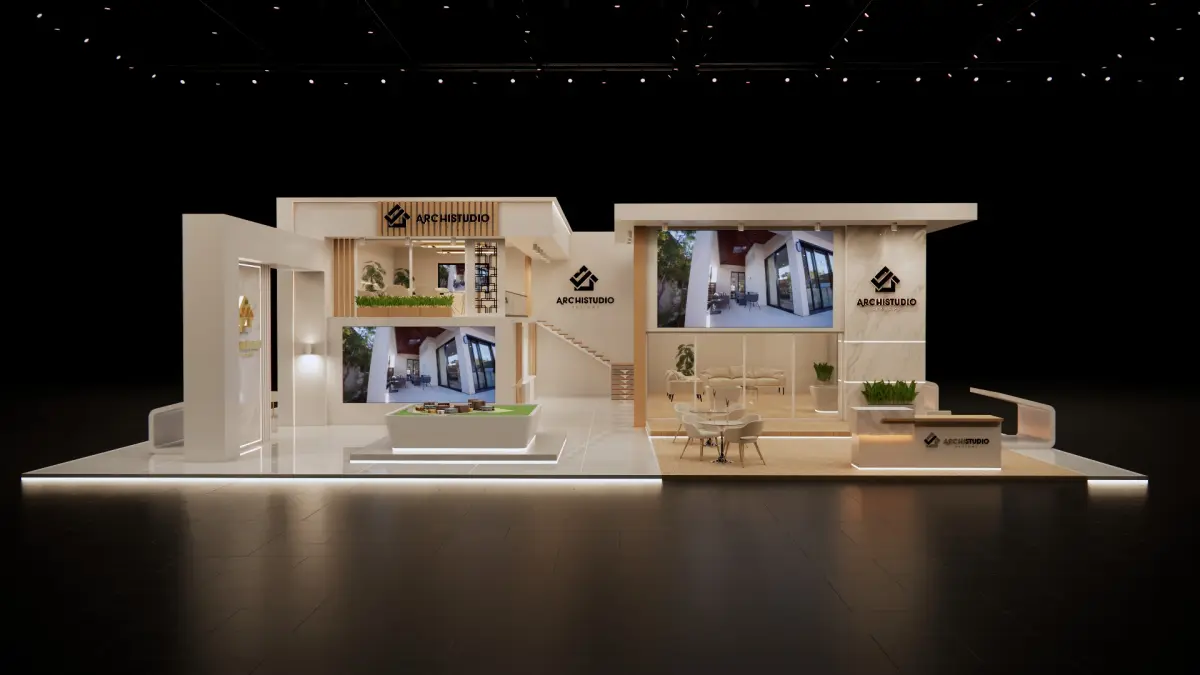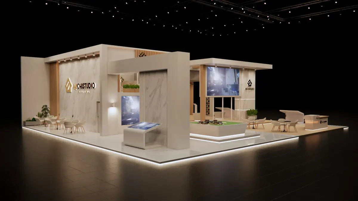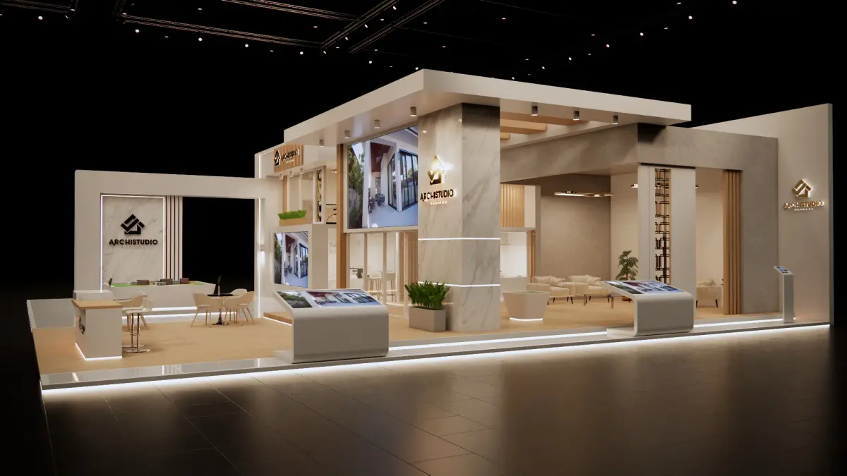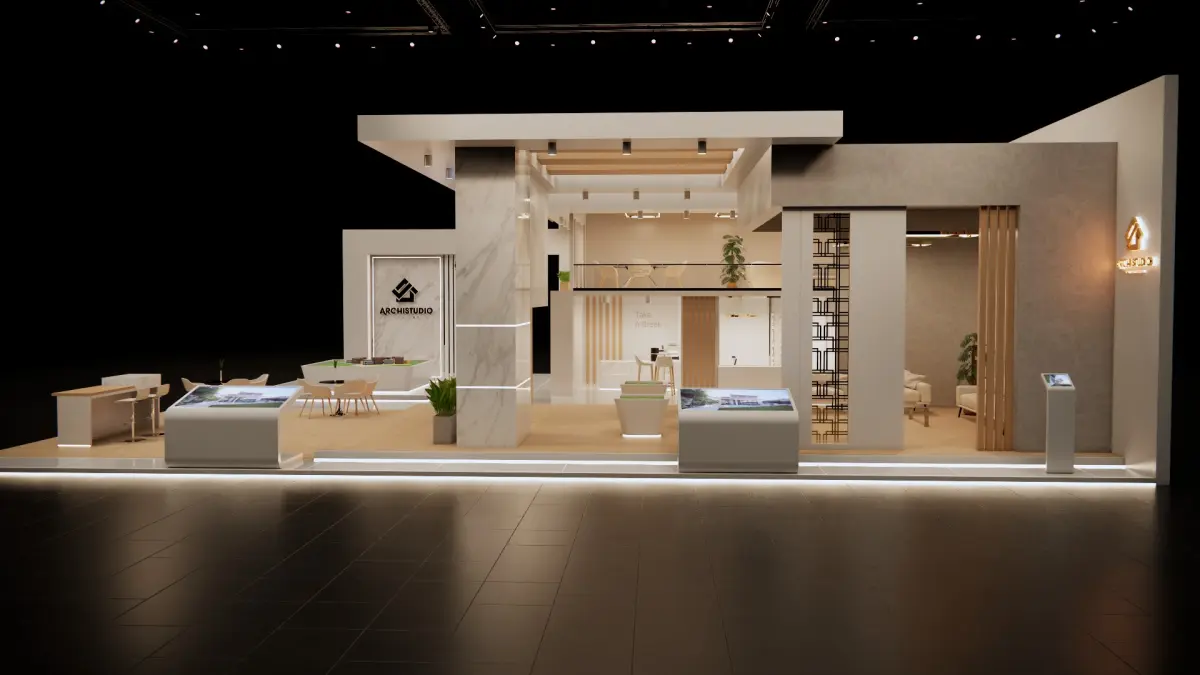 Booth design 380 sq.m (10mx19m) 3D model .Real estate booth design with lounges , sitting areas & LED screens . Ready model for render just place your final edits & branding , several extensions are provided (dae, fbx and 3ds)