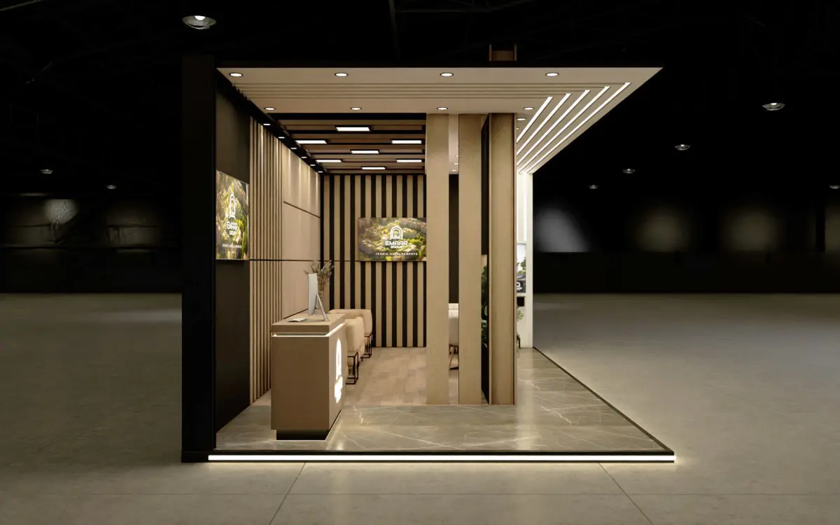 Stand Dimensions : 8m x 4mReception Area : Welcoming space at entryLuxury Private Area : Behind glass partition, office-styleSeating Areas : Two types—casual lounge & formal seatingDisplay Screen : Wall-mounted, positioned near exitNative File : Cinema 4D R26Export Formats : FBX, DAE, OBJ, 3DS