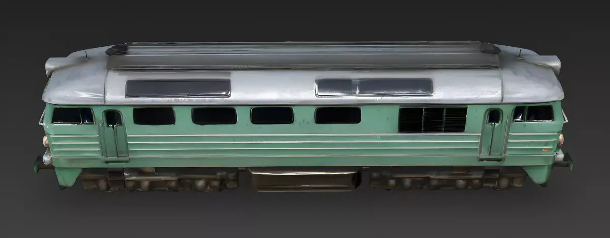 Weathered Seafoam Green and Brushed Steel FinishThe locomotive features a primary body finish of oxidized seafoam green paint with a realistic grime-streaked silver roof, meticulously modeled with authentic surface pitting, deep environmental staining, and prominent years-of-service tarnish. This professional and grounded appearance provides a clear visual story of a regional rail unit operating through diverse climates, providing a sharp visual contrast against the dark-tinted operator windows and the heavy-duty black mechanical undercarriage.