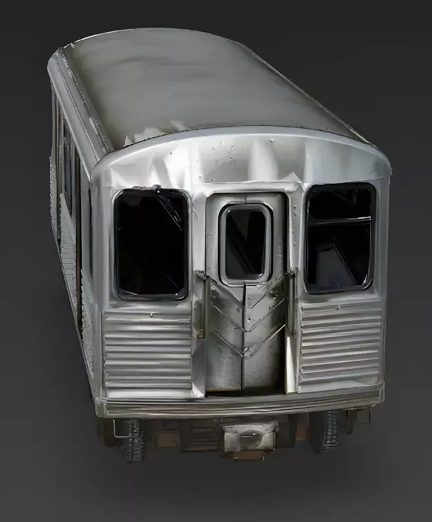 Weathered Stainless Steel and Industrial FinishThe train car features a primary body finish of heavily weathered brushed stainless steel, meticulously modeled with authentic surface pitting, deep environmental staining, and prominent years-of-service tarnish. This professional and grounded appearance provides a clear visual story of a transit unit operating through a busy metropolitan network, providing a sharp visual contrast against the dark-tinted passenger windows and the heavy-duty rusted mechanical undercarriage.