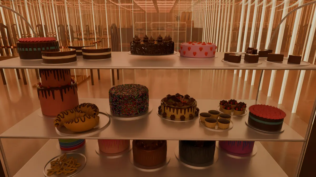 Step into a beautifully designed 3D bakery model, perfect for animations, games, VR/AR experiences, or architectural visualization. This scene features a modern and inviting interior complete with a display counter filled with delicious cakes, cupcakes, and pastries. The bakery includes realistic lighting, elegant wooden furniture, reflective wall details, and a clean, glossy floor that enhances the overall atmosphere.