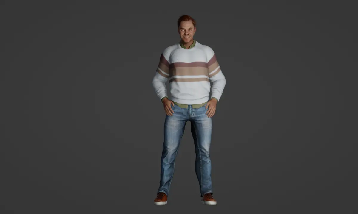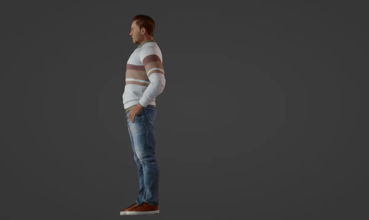 The focal point of this model is the man's attire, featuring a cozy white sweater adorned with distinctive brown horizontal stripes at the center. The classic blue jeans and comfortable brown sneakers with white soles complete his ensemble, adding a touch of casual charm. The attention to detail extends to his brown hair, neatly pulled back, contributing to his quirky yet endearing appearance.