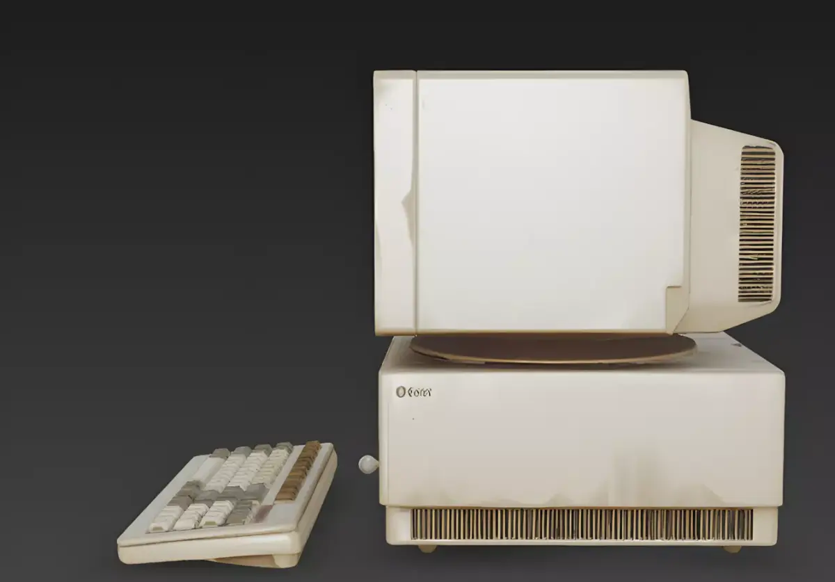 Yellowed Beige Plastic and Textured FinishThe computer features a primary body construction of yellowed beige ABS plastic, meticulously modeled with realistic surface tarnish, localized grime accumulation around the vents, and subtle UV-light bleaching. This professional and grounded appearance provides a clear visual story of long-term office use and environmental exposure, providing a sharp visual contrast against the dark, high-gloss CRT screen.