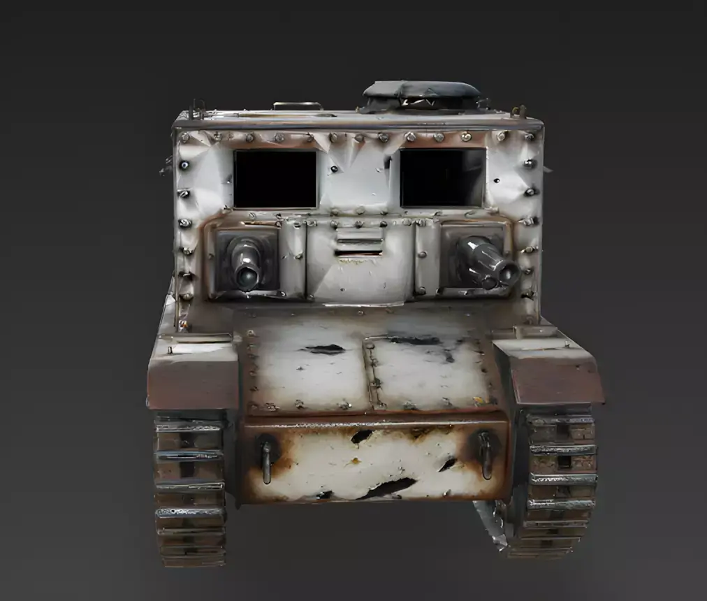Oxidized Steel and Peeling Grey Paint FinishThe tank features a primary body finish of heavily oxidized armored steel and tattered grey-metallic paint, meticulously modeled with realistic surface pitting, massive iron-oxide crusting along the rivet lines, and prominent weather-beaten tarnish. This professional and grounded appearance provides a clear visual story of decades of environmental exposure and abandonment on the front lines, providing a sharp visual contrast against the dark internal shadows of the hatch openings and vision slits.