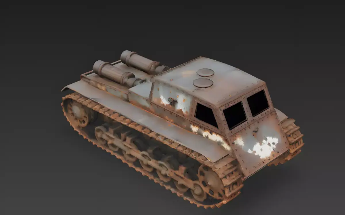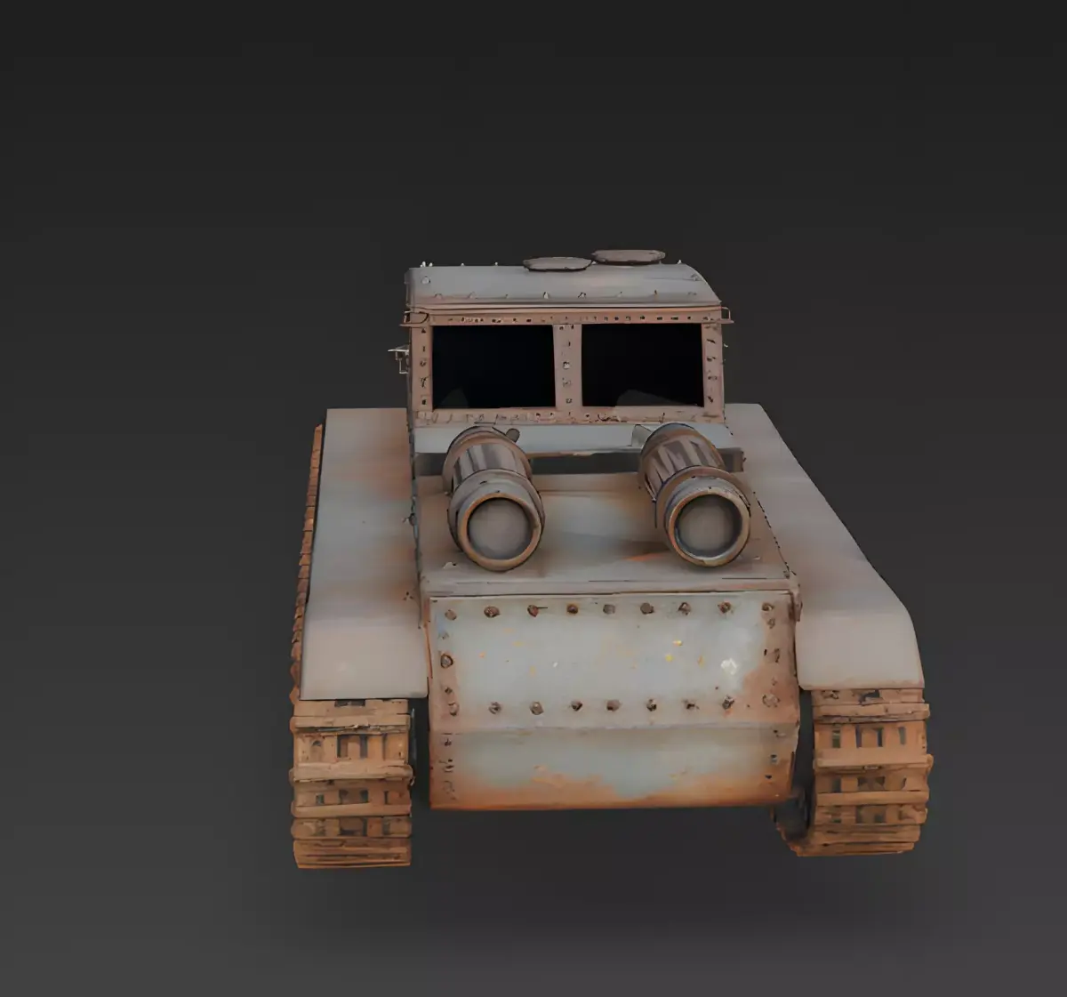 Oxidized Steel and Peeling Blue Paint FinishThe tank features a primary body finish of heavily oxidized armored steel and tattered light-blue paint, meticulously modeled with realistic surface pitting, massive iron-oxide crusting along the rivet lines, and prominent weather-beaten tarnish. This professional and grounded appearance provides a clear visual story of decades of environmental exposure and abandonment on the front lines, providing a sharp visual contrast against the dark, empty viewing slits.
