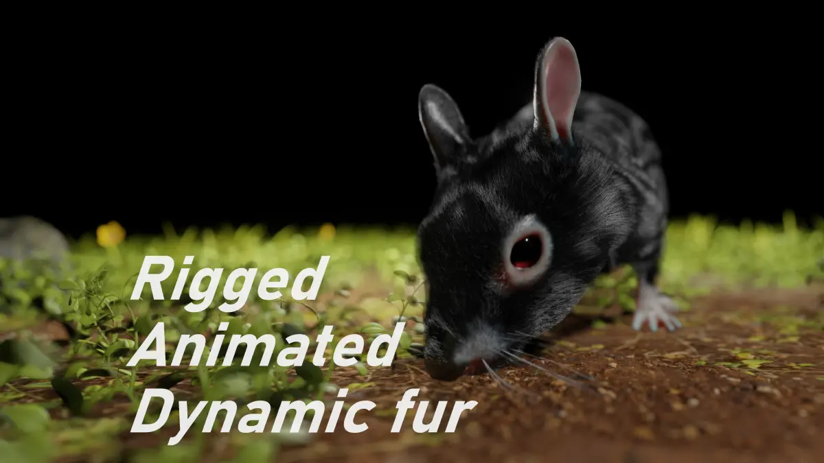 PLEASE NOTE : The hair of the mouse model was created using the hair particle system in blender. You will therefore HAVE TO USE BLENDER IF YOU WANT TO RENDER THE FUR. By default the viewport visibility of the fur is disabled. I suggest to leave it disabled when adjusting the scene or animating, since the fur will create a considerable amount of lag in the viewport. The hair color can be switched easaly in the material setup. it can be one colored or colored by using a procedural or image texture.
