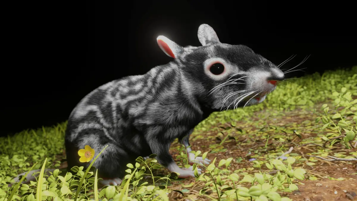 The mouse_all_packed.blend file contains the complete animation of the mouse as it can be seen in the linked youtube video. All assets, like the foliage, sticks rock and ground are mid to high poly assets and are also included in the .blend file. All textures are also packed into this file. The mouse model itself is textured with a skin texture plus hair partticles above it and rigged with useful IK controlers and constraints for animation. The tail can be animated using 3 emptys that are controlpoints for a curve, which guides the actual deformation bones. This way, dragging and swinging motions of the tail are easier to animate.