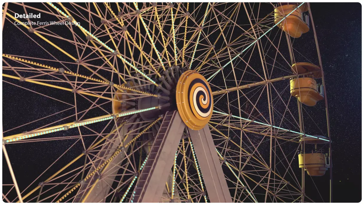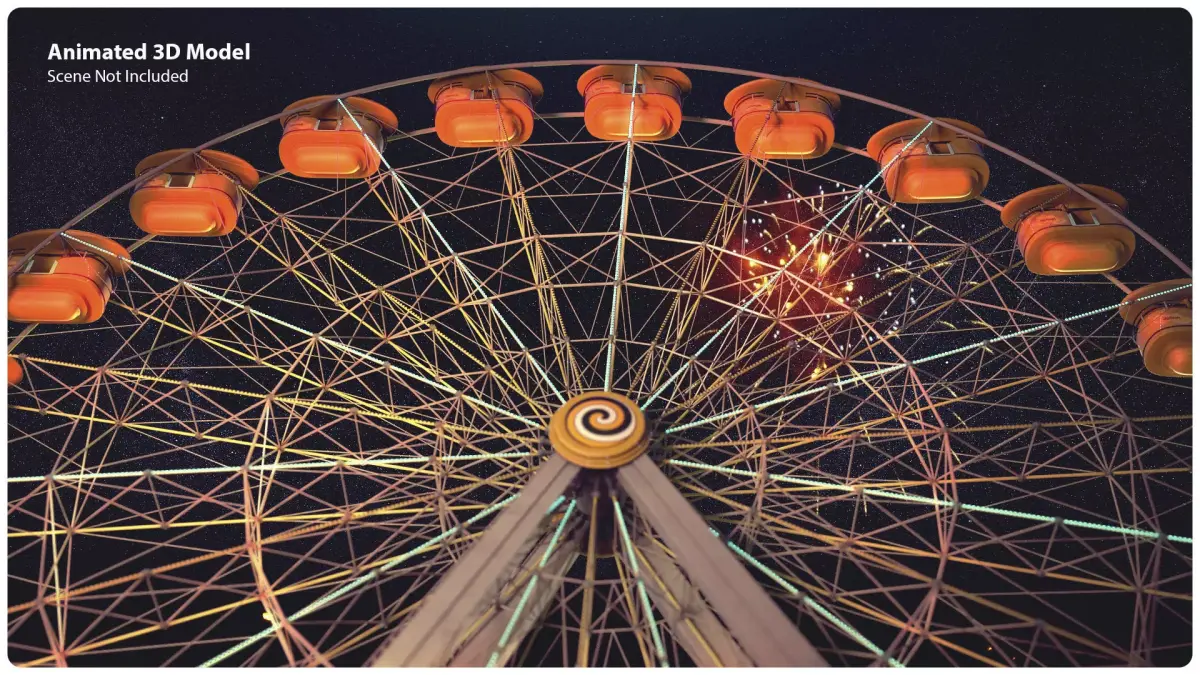Detailed ferris wheel 3D model. Animated rotation and cart swing. Multiple formats.