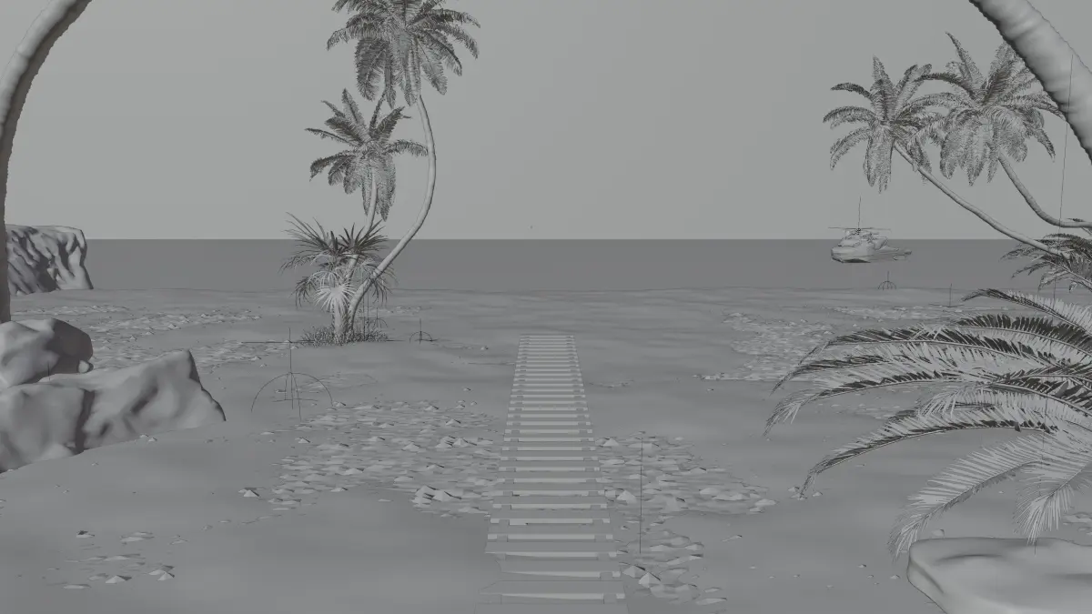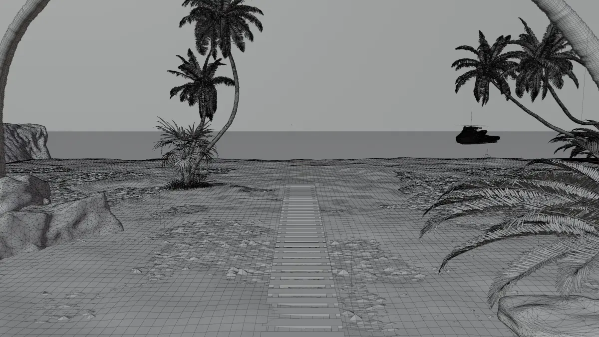 Features:Detailed wooden dock, rocks, palm trees, ocean, and tropical island layout