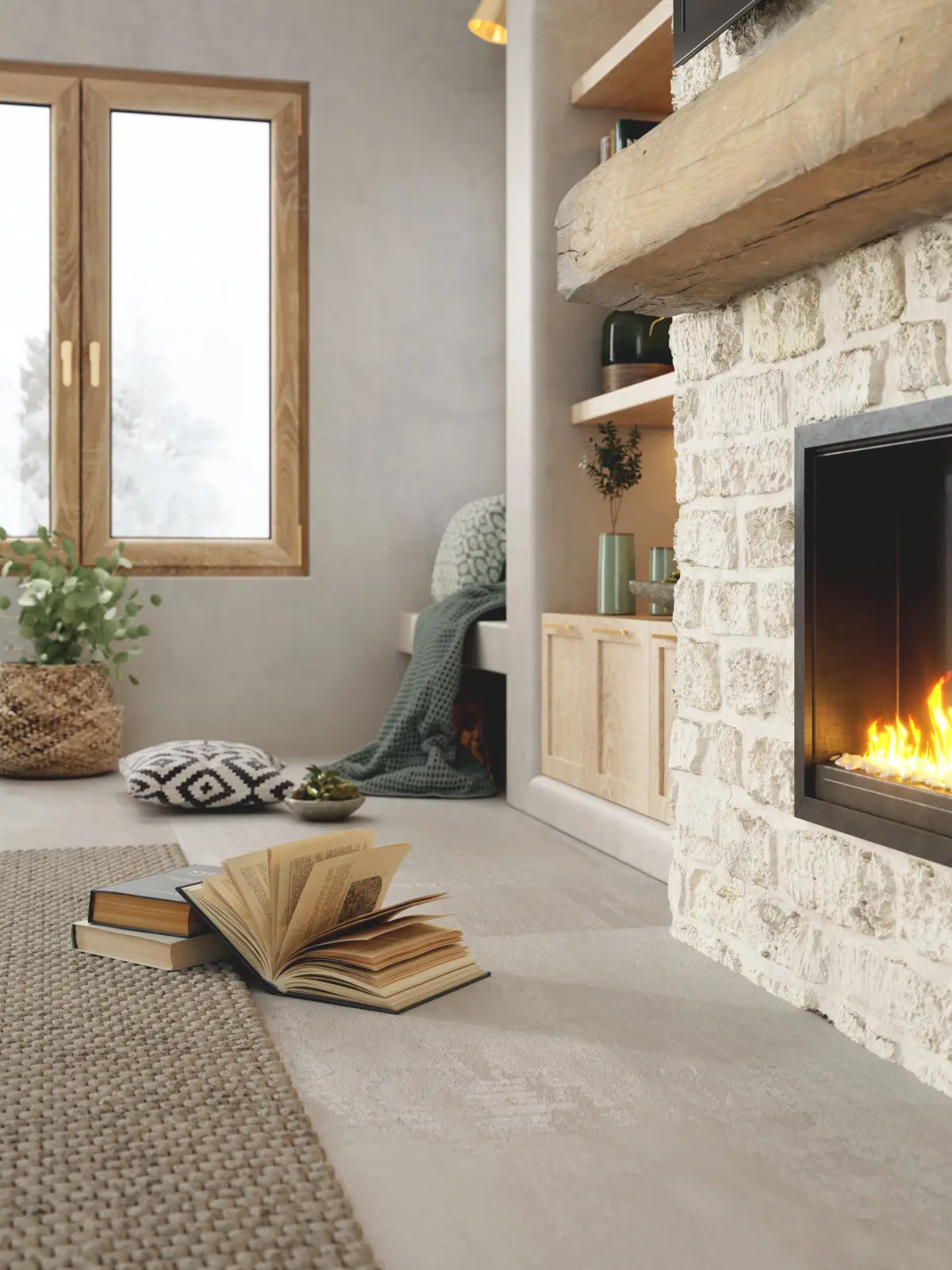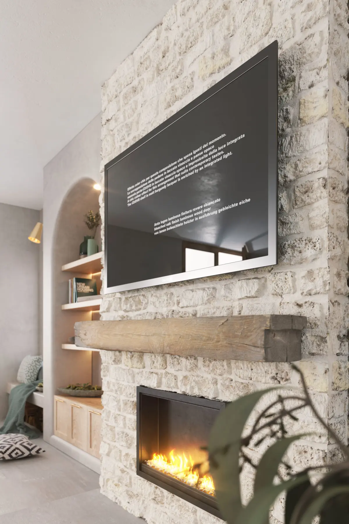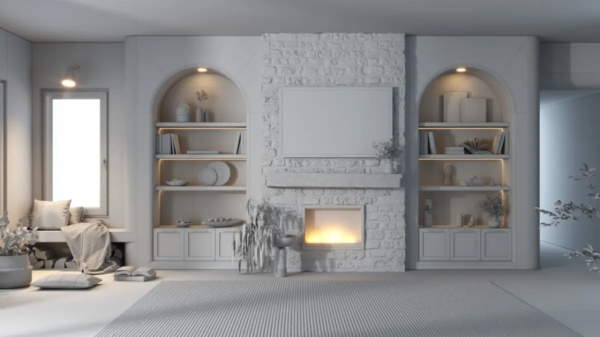 A high-quality Bohemian wall design 3D scene featuring arched shelves, a natural stone fireplace, warm wooden elements, soft textures, plants, and cozy decor.Fully detailed, photorealistic, and render-ready for architectural visualization, CGI, and interior design projects.texture and fbx in .txt file