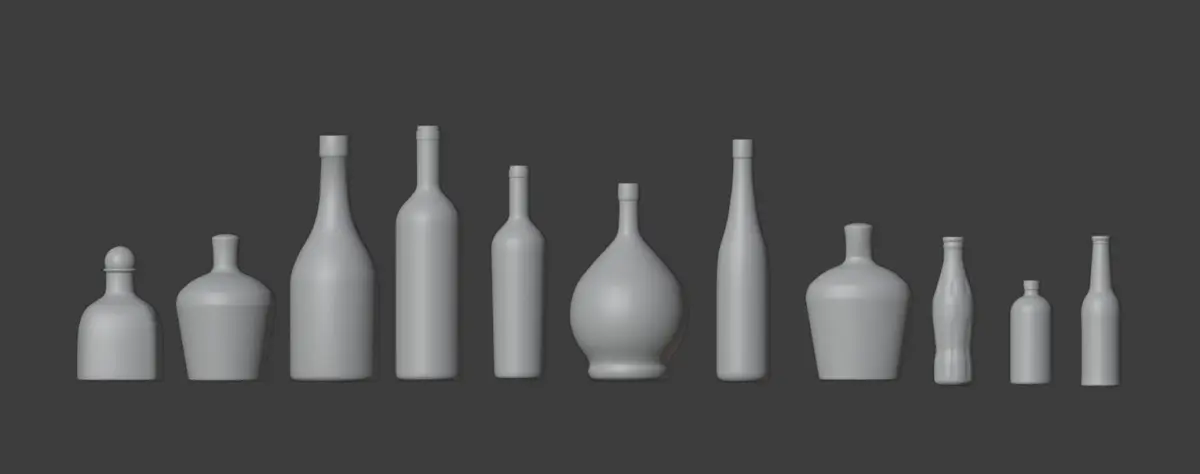 Included Models:Standard Wine BottleFiasco BottleBeer Bottle (with separated cap)Coke/Soda Bottle (with separated cap)Generic liquor decanter“Crown” Style Glass BottleChampagne Bottle (Two variations)Sparkling Beverage BottlePatron Style Tequila Bottle