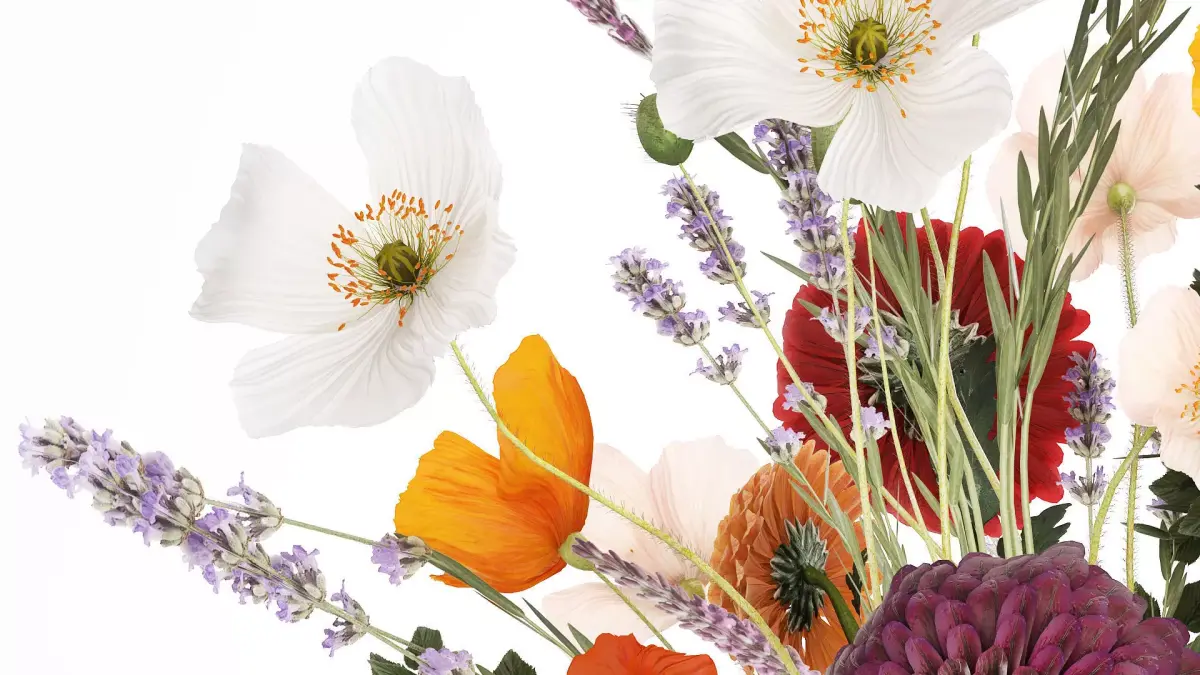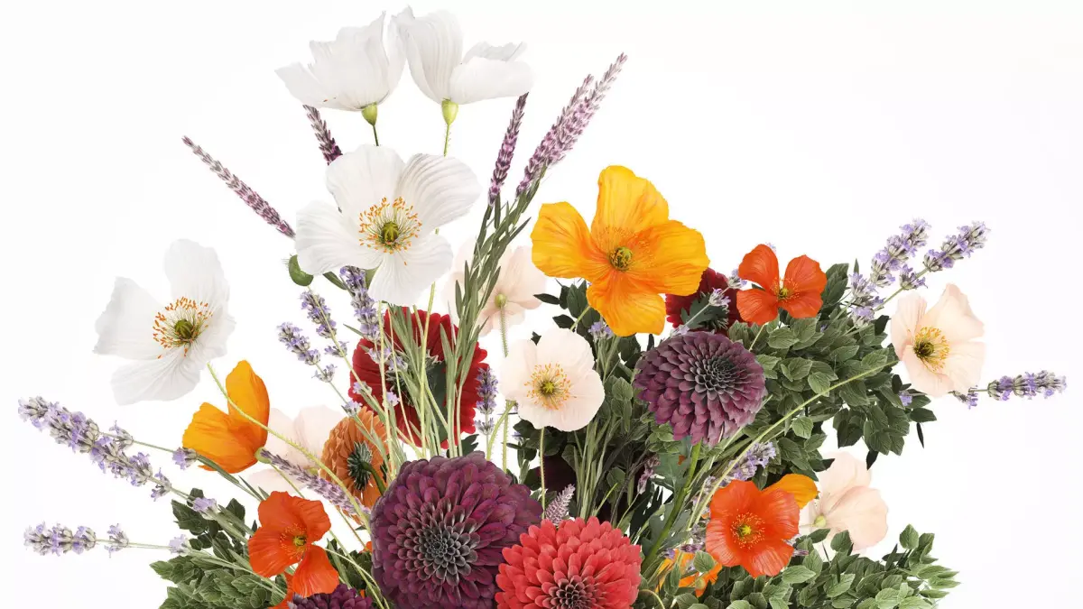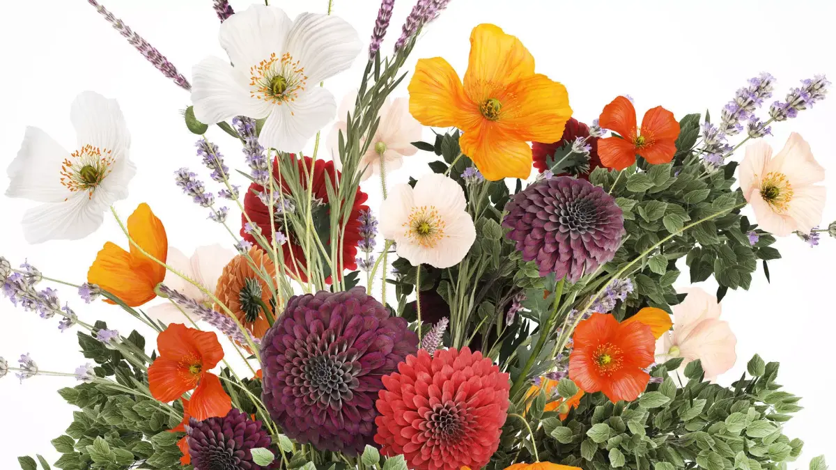 Realistic flower bouquet of poppies, green branches and lavender in a modern glass vase. Set 630.Dahlias - Dahliaschrysanthemum, golden-daisy - ChrysanthemumSpring BouquetLavender - Lavandula, lavenderCatmint - NepetaSage - Salvia nemorosaWildflower BouquetPapaver nudicaule - Poppy, Icelandic poppyVase