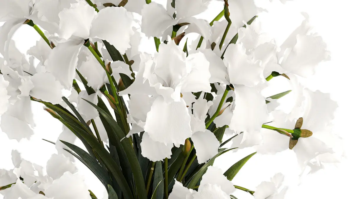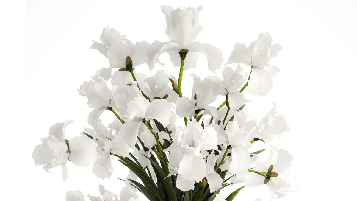 Realistic bouquet of white Iris flowers in a glass vase