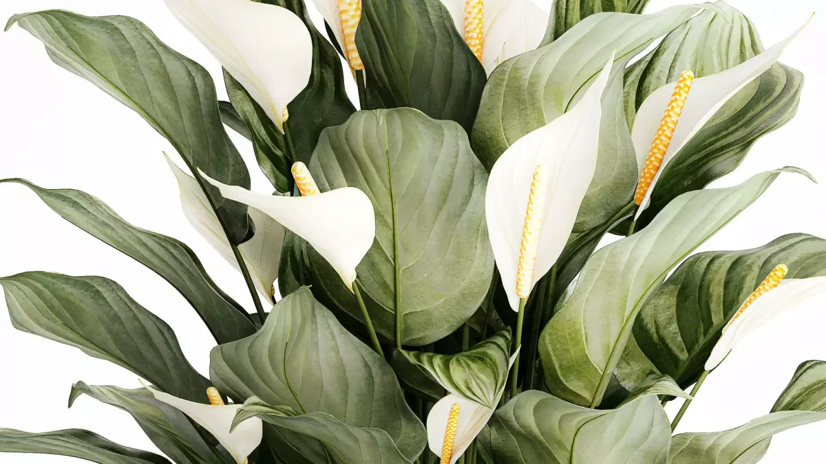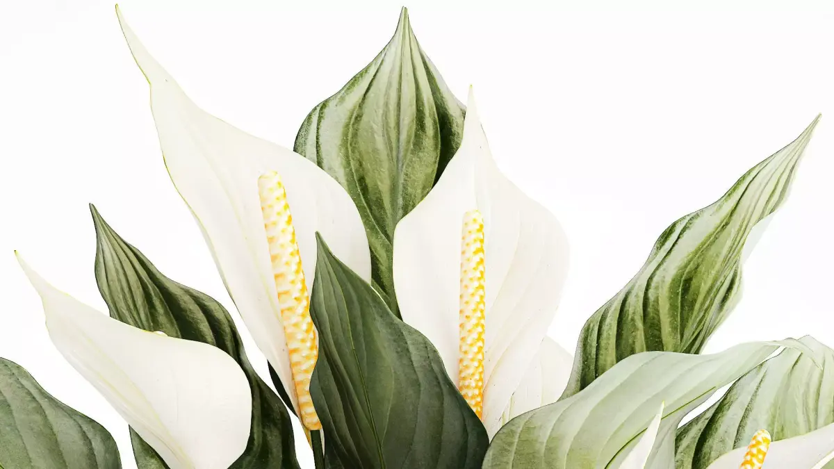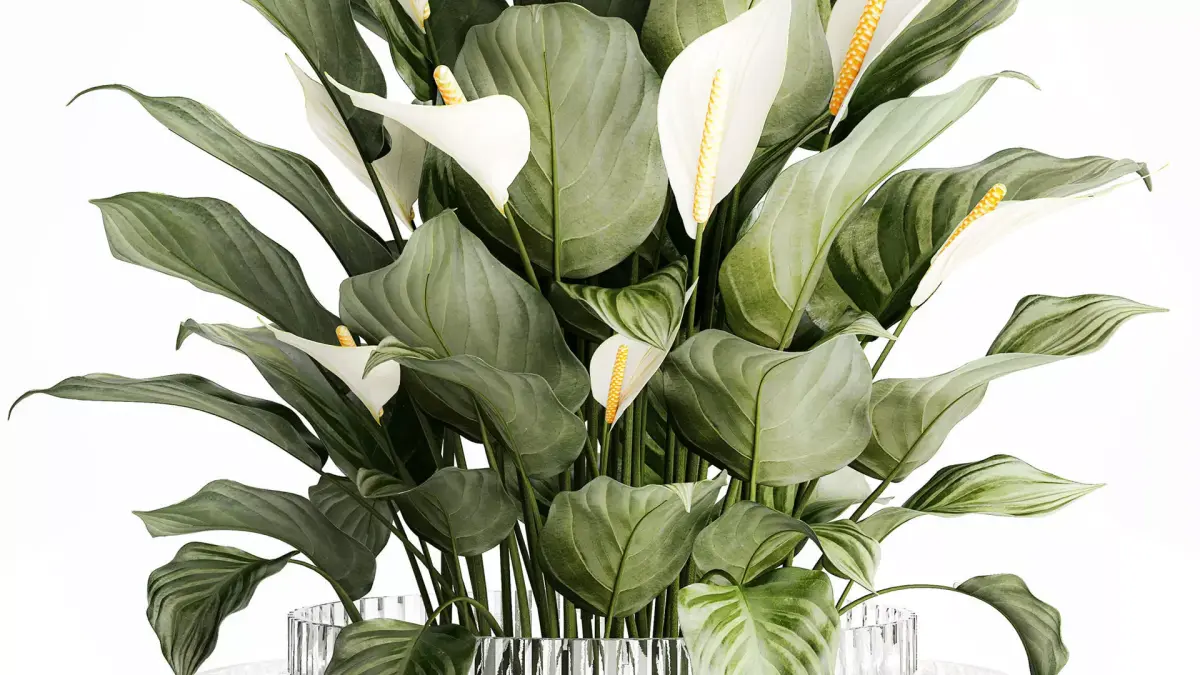 Modern realistic bouquet in a glass vase of green leaves with white Spathiphyllum. Set 614.Beautiful small formal bouquet of monochrome flowers in a modern glass vaseSpring bouquetSpring bouquetSummer bouquetWedding decormonochromevasedelicateSpathiphyllum - Spathiphyllum