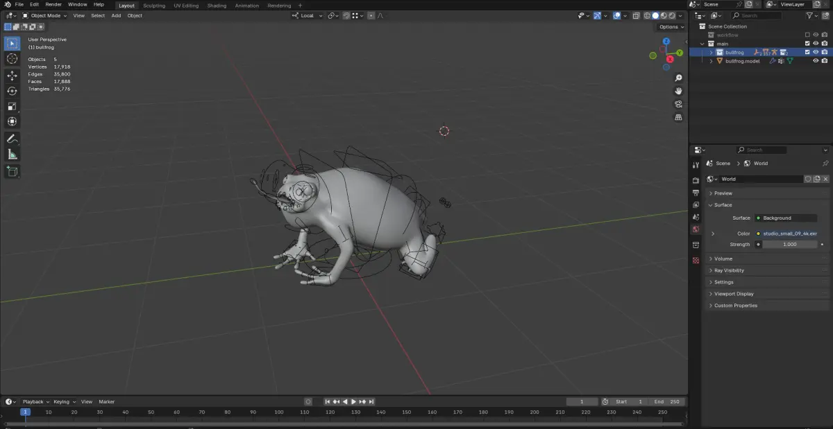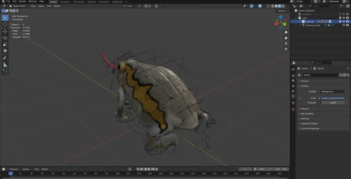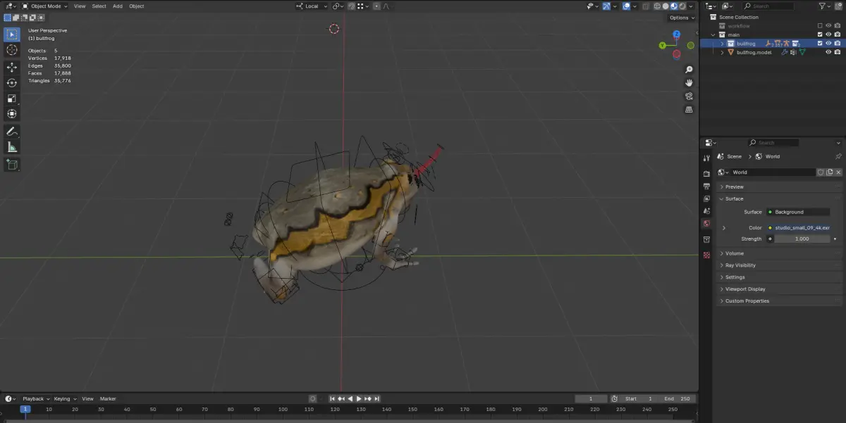 Ideal For:Game development (realistic or stylized)Animated films or cutscenesAR/VR interactive appsEducational or scientific visualizationWeb-based 3D platforms (via glTF/GLB)Included Files:Bullfrog.blendBullfrog.fbxBullfrog.glbTexture maps
