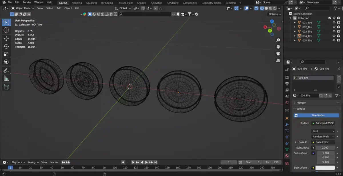 This 3D model pack includes five highly detailed and realistic car tires, designed for use in various vehicles and racing environments. Each tire is carefully modeled and textured in Blender 3.4 with PBR materials, including diffuse, roughness, metallic, AO, and normal maps.