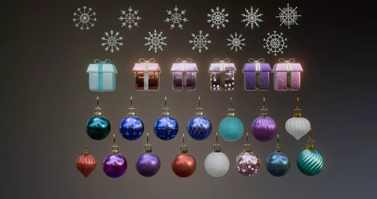 In this pack, you will get 11 Unique Snowflakes,6 Gift Boxes,15 Ornament Balls,created with Blender.All materials are fully procedural in Blender.Includes metallic, glossy, glass and glitter shaders.Perfect for holiday renders, product visuals, and festive illustrations etc.