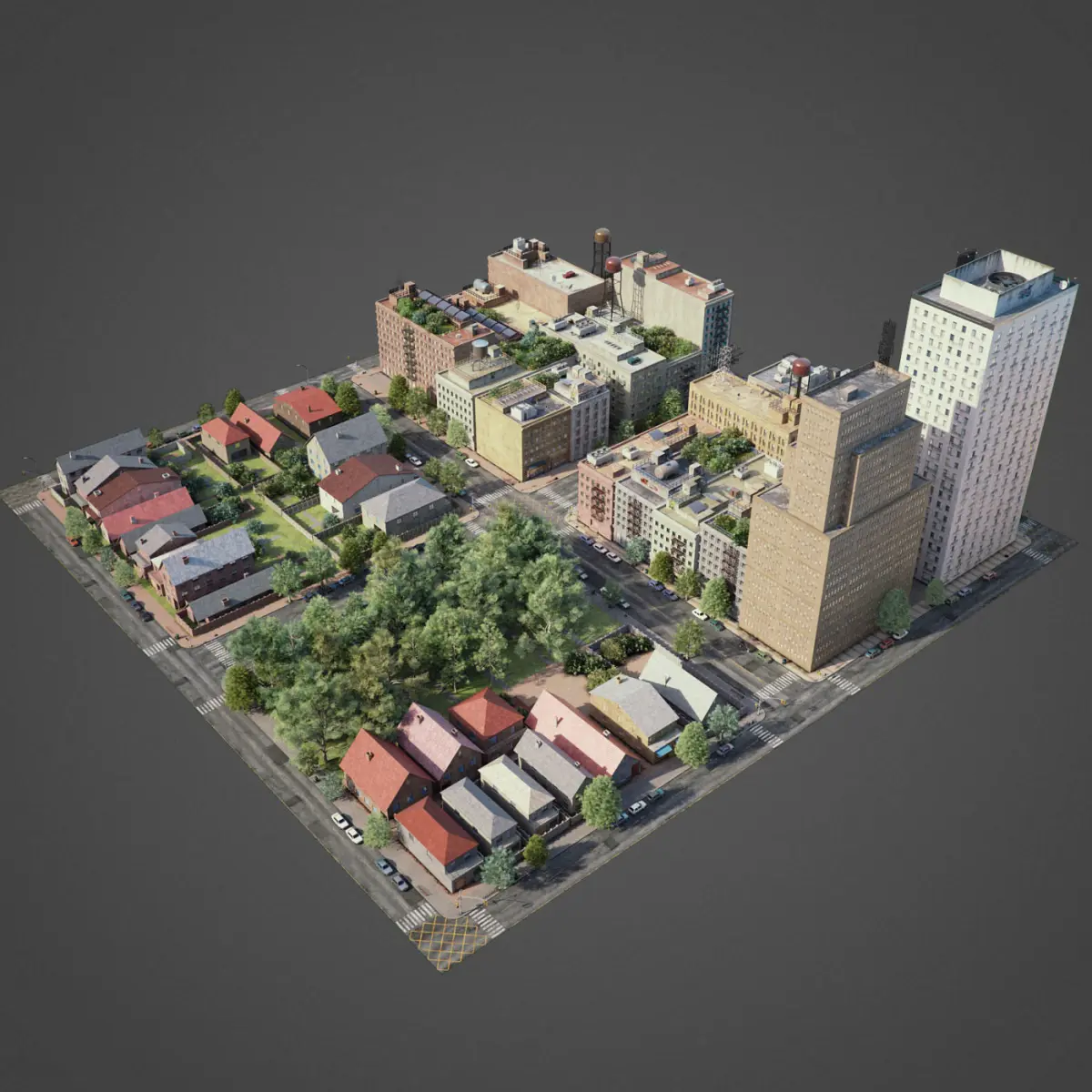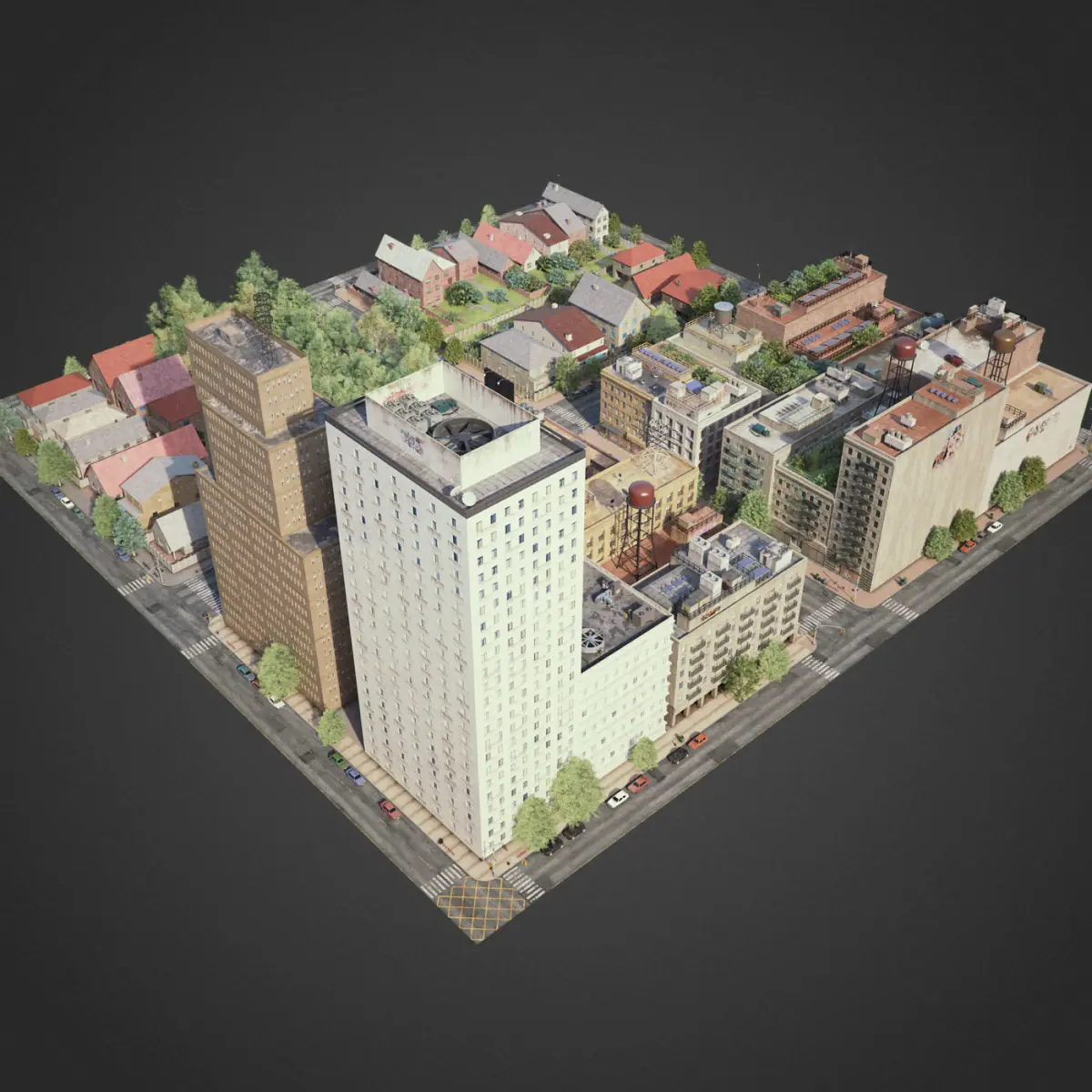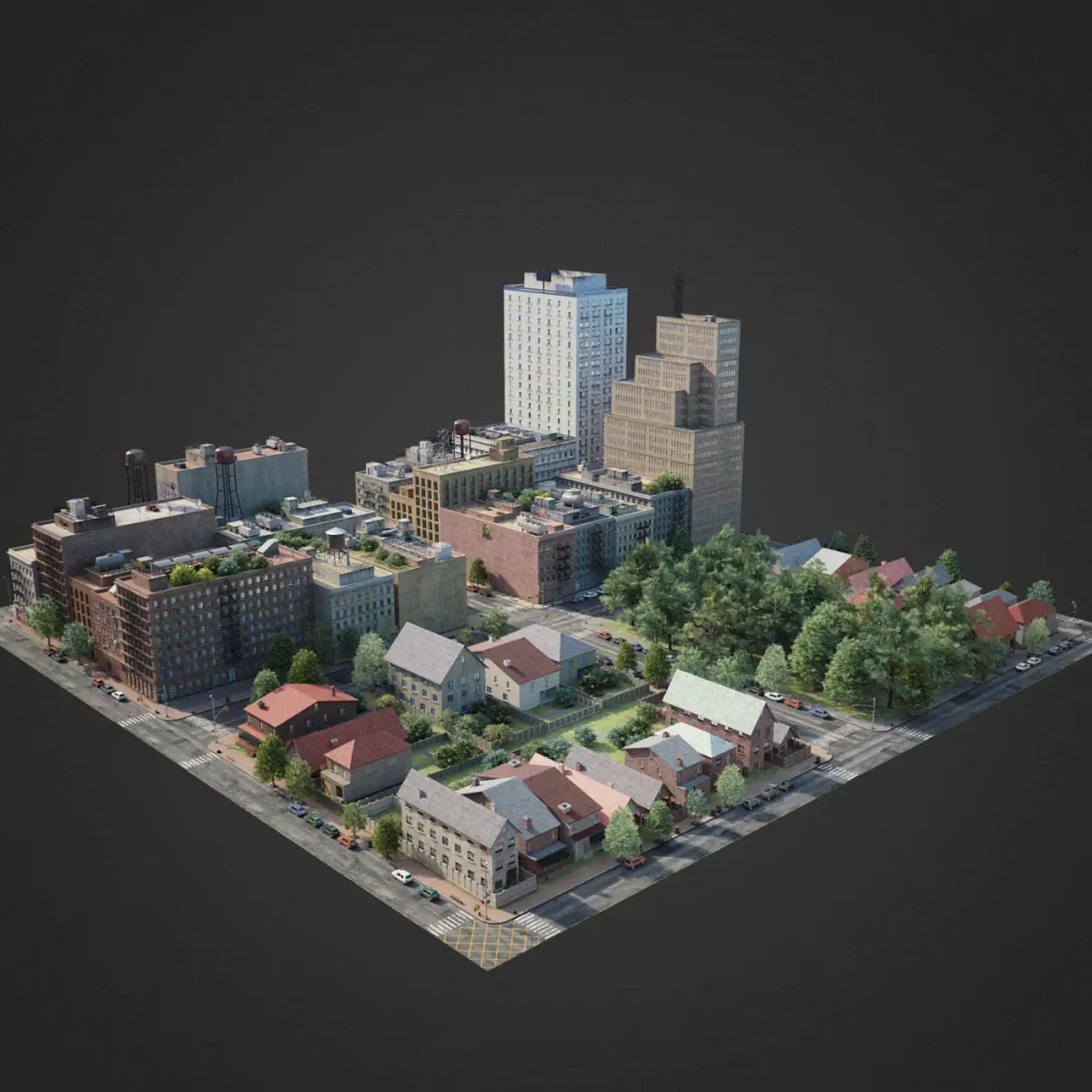 This is full 3d city model modeled based on americans cities. This is real world scale model. Whole scene setuped and fully ready to render. All materials setuped in Vray. Light setuped by HDRI and Dome light.