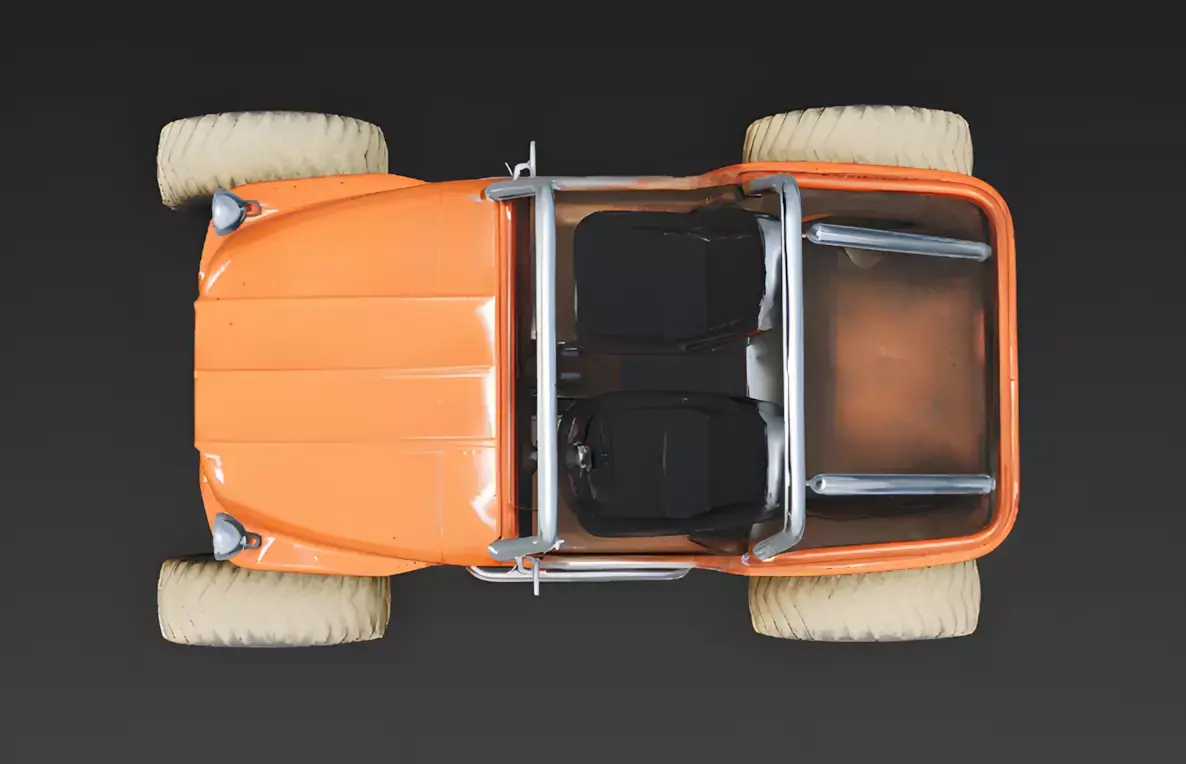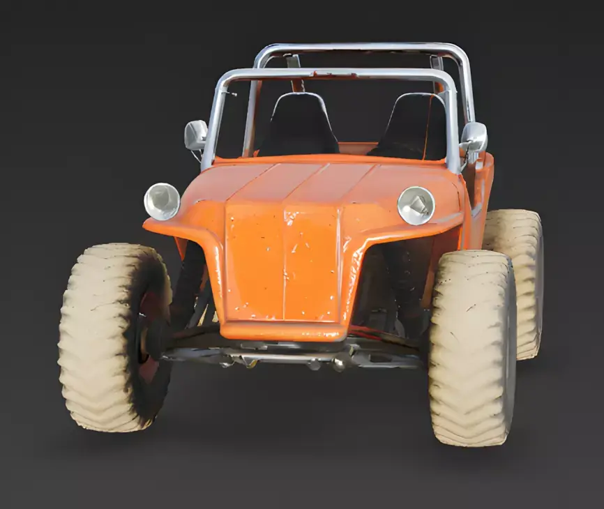 Weathered Orange Fiberglass and Chrome FinishThe buggy features a primary body construction of weathered orange fiberglass, meticulously modeled with realistic surface oxidation, localized paint pitting, and prominent salt-air corrosion along the lower edges. This is complemented by a high-polish chrome roll cage and side rails, providing a professional and grounded appearance that tells a clear story of frequent coastal use and environmental exposure.