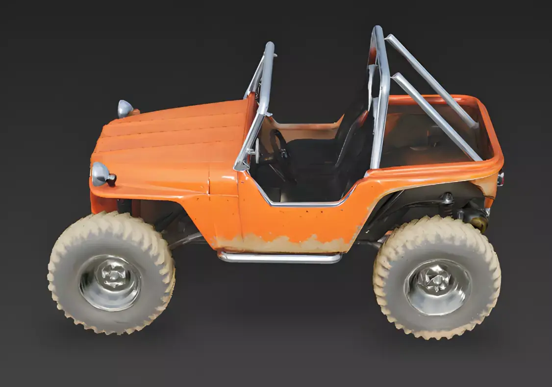 Quick Tip: To enhance the realism in a sun-drenched beach or desert scene, apply a high-gloss Roughness Map specifically to the chrome roll cage and the headlight lenses. This will create sharp light reflections that contrast beautifully with the matte, sand-covered tires and weathered body panels under dynamic lighting, showcasing the asset's diverse material quality and premium retro design.