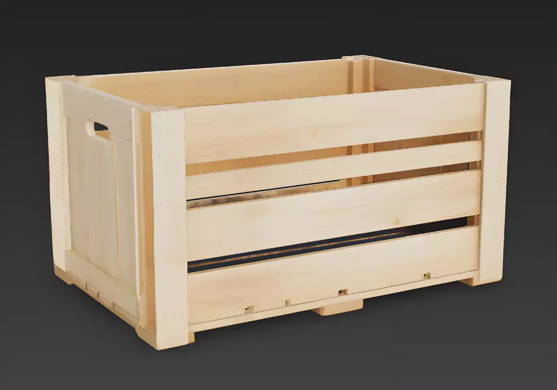 Natural Pine and Light Oak FinishThe crate features a primary body finish of unfinished natural pine with realistic wood-grain textures, meticulously modeled with authentic surface knots, subtle grain directional changes, and prominent fresh-cut highlights. This professional and clean appearance provides a clear visual story of a functional storage unit, providing a sharp visual contrast against the dark internal shadows between the slats and the subtle metallic sheen of the recessed assembly nails.