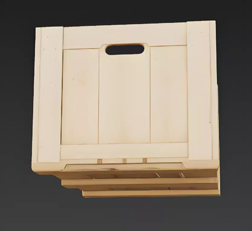 High-Fidelity Slatted Construction and Handle GeometryA primary feature of this model is the integrated horizontal-slat ventilation and ergonomic side-handle cutouts. Every individual timber plank on the side walls, the recessed joinery at the corners, and the realistic beveled edges of the handle openings are modeled with significant surface depth, providing a clear visual indicator of traditional carpentry and adding incredible tactile detail for close-up inspection.