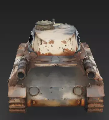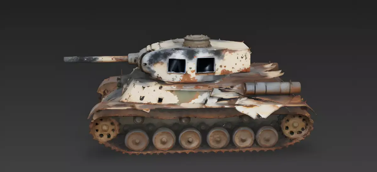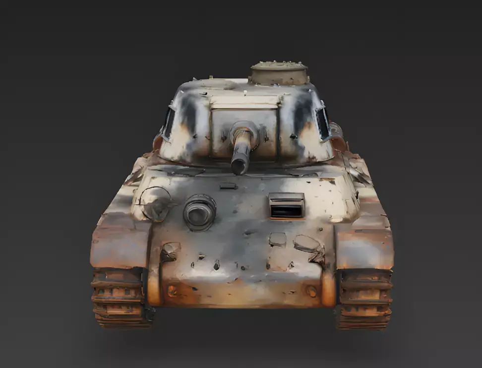 Oxidized Steel and Peeling Tan Camouflage FinishThe tank features a primary body finish of heavily oxidized armored steel and tattered desert-tan camouflage, meticulously modeled with realistic surface pitting, massive iron-oxide crusting along the chassis, and prominent weather-beaten tarnish. This professional and grounded appearance provides a clear visual story of decades of environmental exposure and abandonment on the front lines, providing a sharp visual contrast against the soot-blackened turret and scorched metal plates.