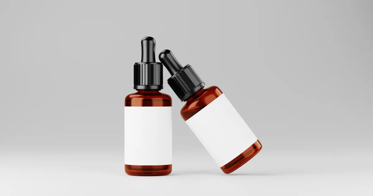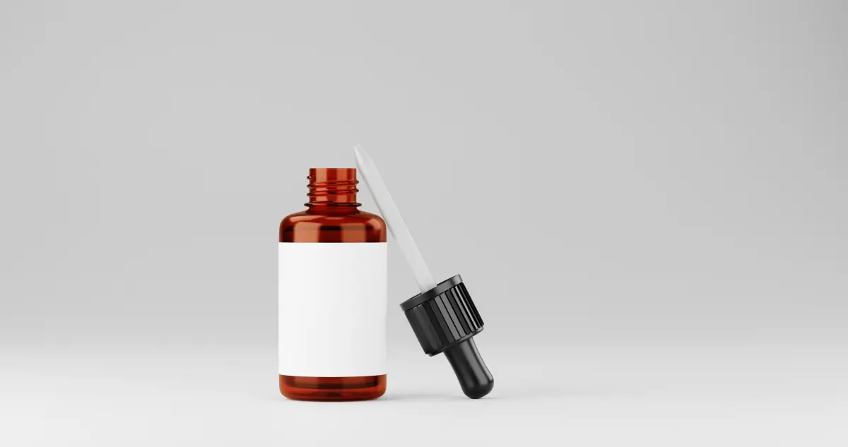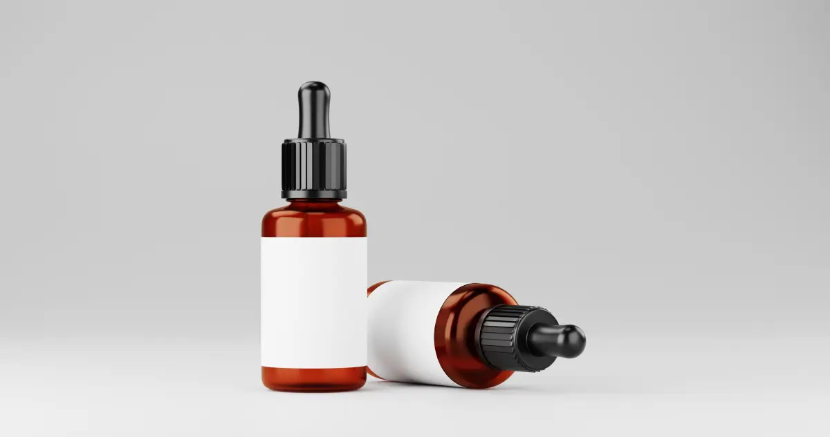 The image shows a brown glass dropper bottle with a black rubber and ribbed plastic cap. The bottle has a blank white label, suggesting it is ready for custom branding or product information. The background is a minimalistic light grey, and the bottle appears to be floating or suspended in mid-air, giving it a clean and modern presentation, often used for product mockups or advertising design.