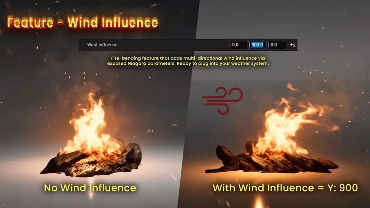 - Fire reacts to multi directional wind via exposed Niagara parameters. Flames bend naturally based on wind strength and direction and can be plugged directly into dynamic weather systems.