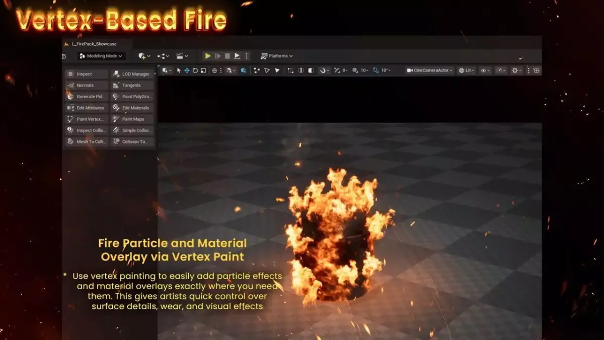 - Use vertex painting to place fire particles and fire material overlays exactly where needed on meshes such as barrels, props, walls, or debris for precise artistic control.