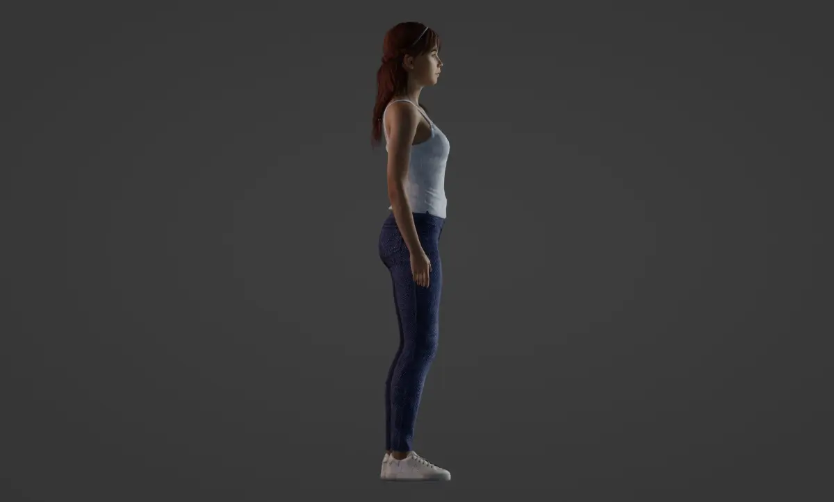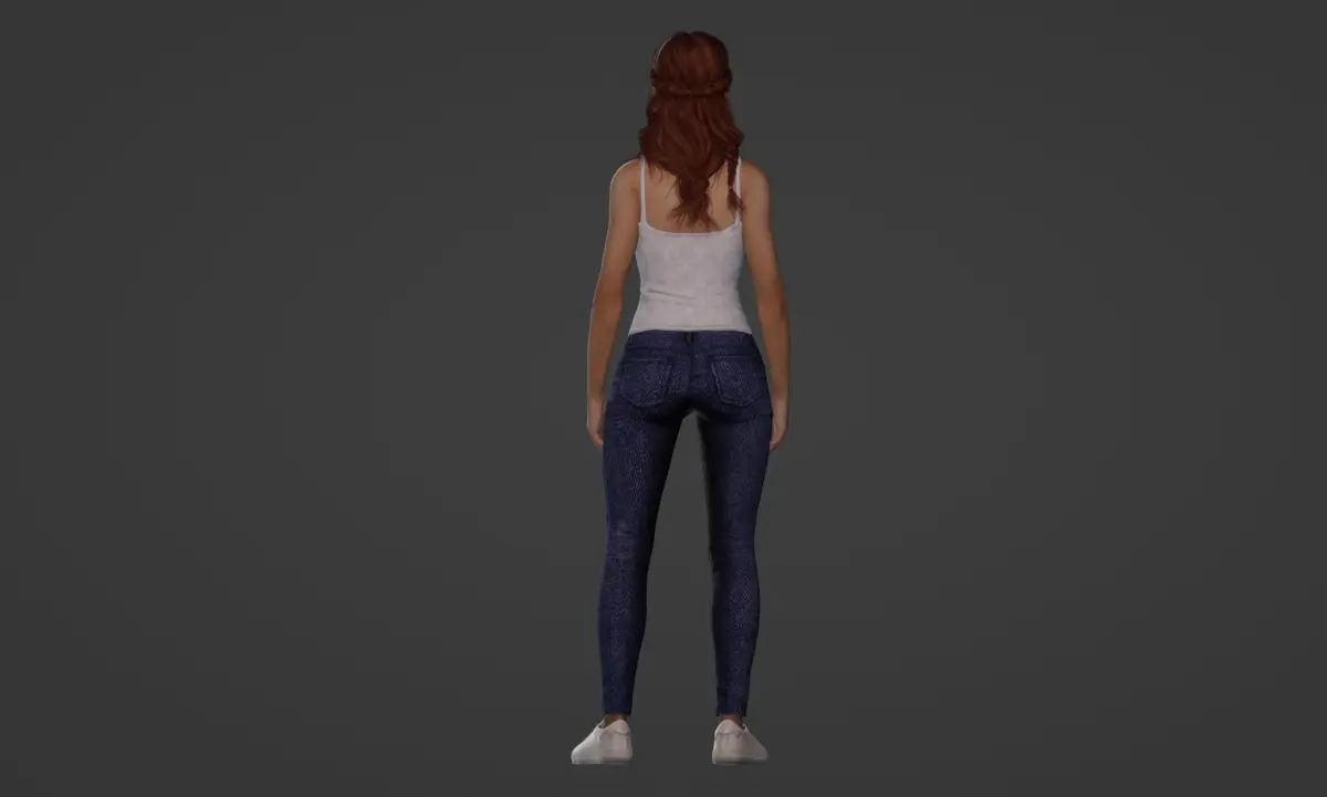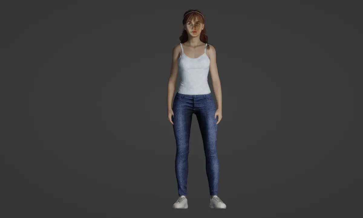 The skin texture is a key highlight, as it is meticulously designed to achieve a light and realistic appearance, further contributing to the lifelike quality of the character. The girl is dressed in a white standard tank top paired with plain blue jeans and gray sneakers, creating a casual and relatable look. The standing pose is normal and versatile, making it suitable for a variety of projects, from animations to still renders.