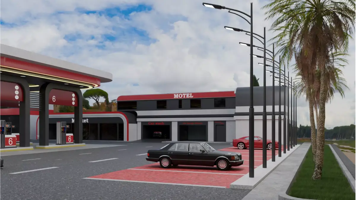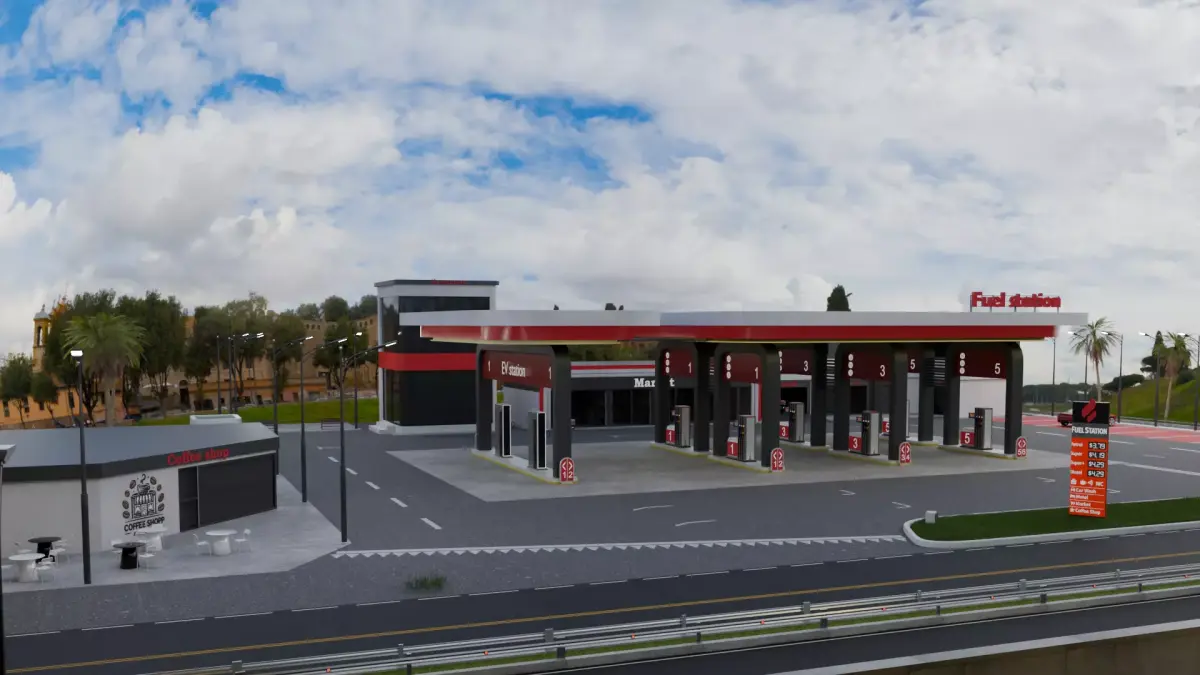 Fuel pumps: 6 for regular fuel + 2 for electric carsAdditional props: benches, security posts, coffee shop, workshop, restaurant, and landscaped grassy areasGrass / Landscaping:Grass implemented using Geometry NodesEasy to adjust density, scale, and distributionEditable and optimized for flexible useVehicles:4 vehicle models included3 are fully detailed and rig-readyAll vehicles sourced from CGTrader’s free modelsModel Details:All objects properly scaled and UV unwrappedReady for rendering or use in projectsEvery element created with care to ensure a polished, professional resultHDRI:8K HDRI included in the fileCan be used for realistic lighting and renderingNotes:Enjoy using this model in your scenes!Grass and props can be adjusted or resized easily thanks to the Geometry Nodes setupPerfect for architectural visualization, games, or virtual environments