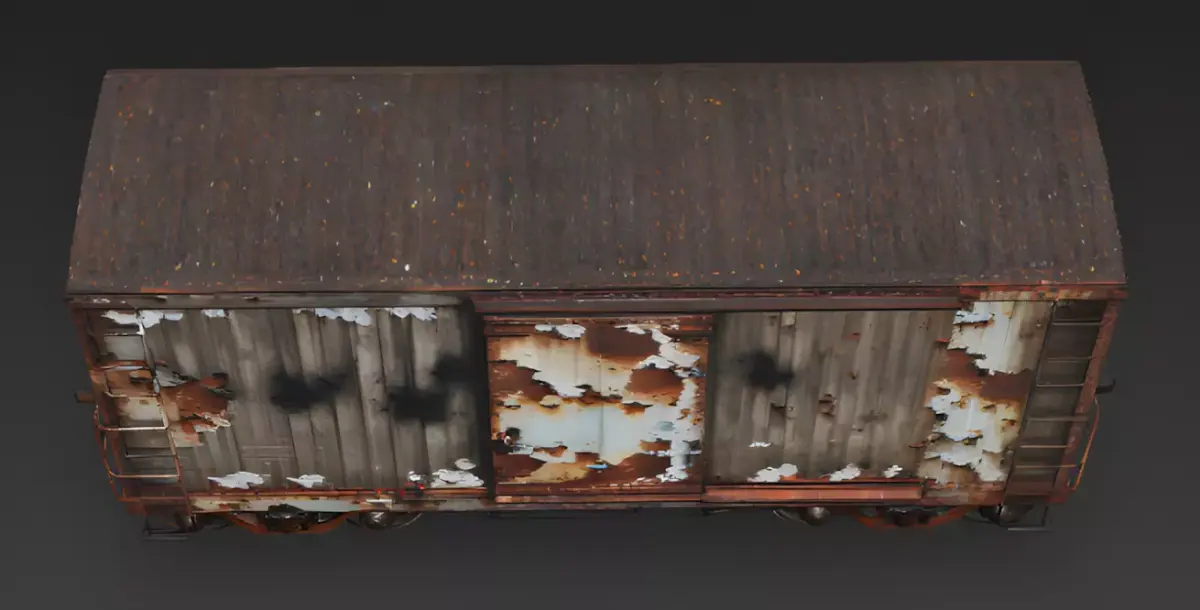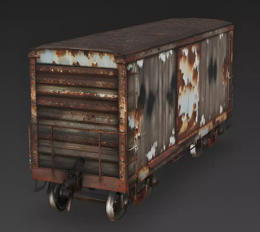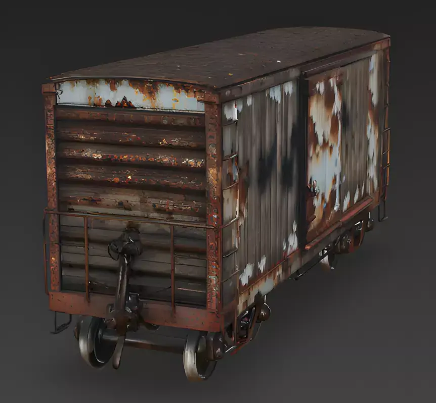 Weathered Wood-Slat and Flaking Blue Paint FinishThe car features a primary body finish of weathered vertical wooden slats and heavily oxidized industrial steel, meticulously modeled with realistic surface wood-grain, massive flaking of old blue paint, and prominent iron-oxide pitting. This long-term-abandonment aesthetic provides a professional and grounded appearance that tells a clear story of decades of environmental exposure and thermal insulation failure, providing a sharp visual contrast against the dark soot-stains on the panels.