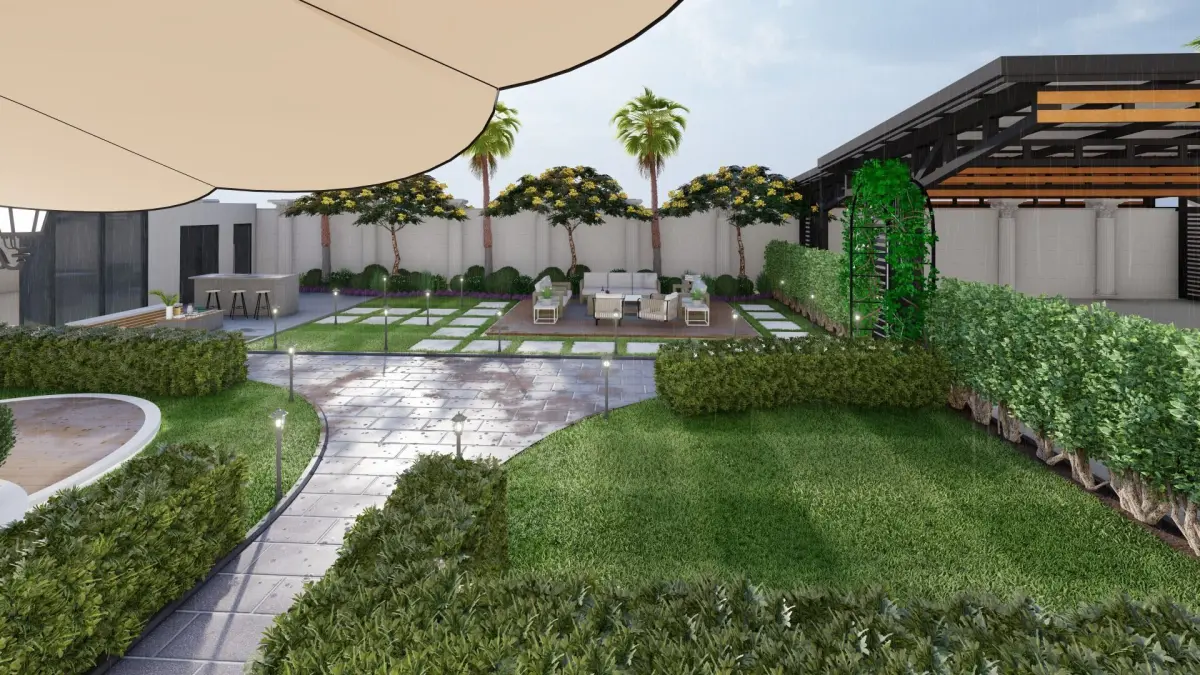 ️ Wooden seater with surrounding plants for a natural ambiance️ BBQ area – perfect for outdoor gatherings️ Stepping stones for an elegant pathway design️ Small tent for shaded relaxation Bollard lights & garden lights for enhanced night-time aesthetics️Realistic textures and detailed planting area
