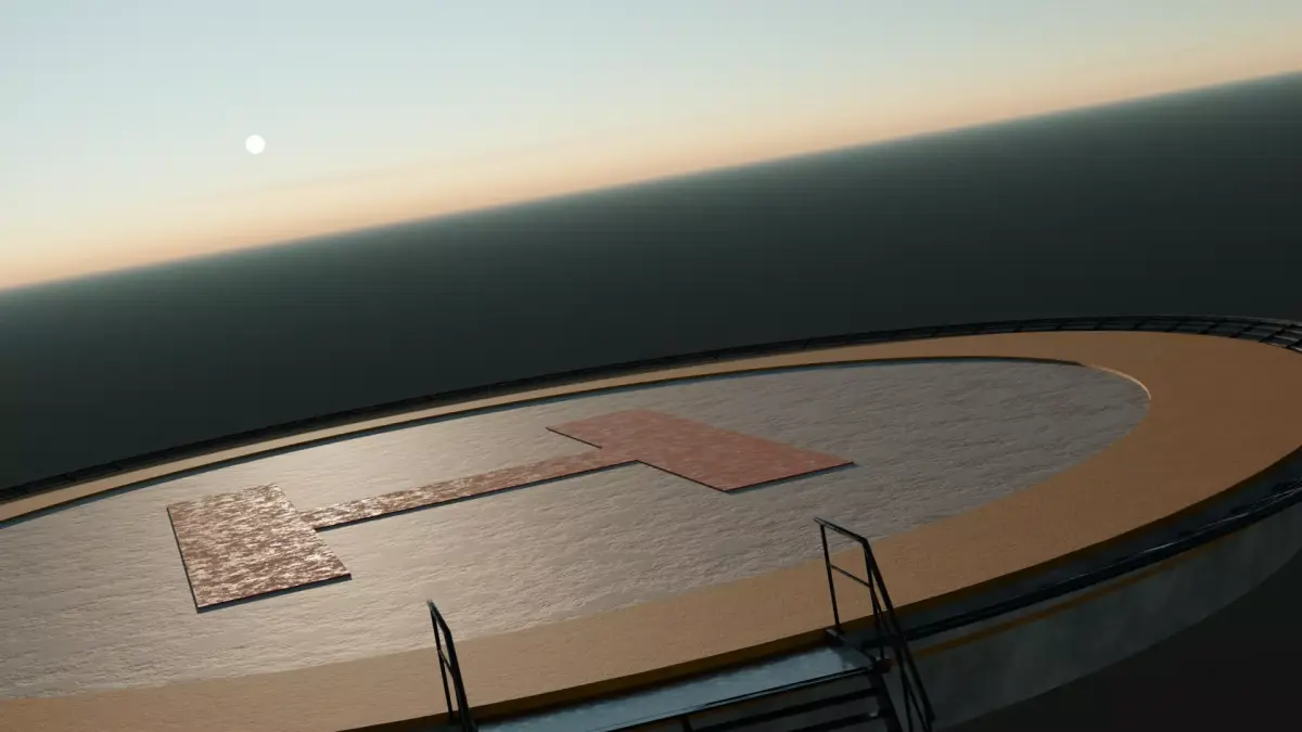 Circular helipad platform with a bold red “H” landing mark.