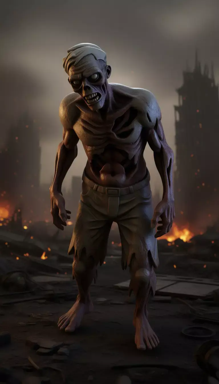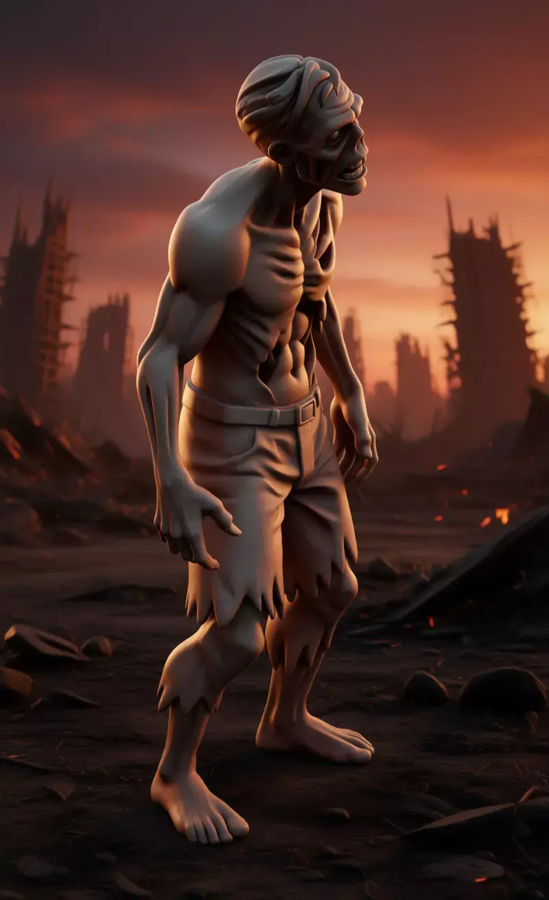 High-resolution, photorealistic 3D model of a grotesque, emaciated zombie.Detailed anatomy showing exposed bones, muscles, and decaying flesh.Tattered clothing and bare feet, enhancing its post-apocalyptic look.Set in a desolate, ruined cityscape with a haunting, atmospheric background.Fully rigged for animation with a comprehensive set of controls for movement and expression.Available in multiple industry-standard file formats for easy import.Ideal for use in horror games, survival simulations, films, and VR experiences.Perfect for apocalypse, zombie outbreak, undead, and dystopian themes.Rich in detail: wounds, textures, lighting, and environmental storytelling.Designed to evoke fear, tension, and a sense of overwhelming dread.This 3D model is not just a character; it is a symbol of the end of the world, bringing the chilling reality of a zombie apocalypse to life in your digital creations. Download it today to add a layer of authentic horror and suspense to your next project.