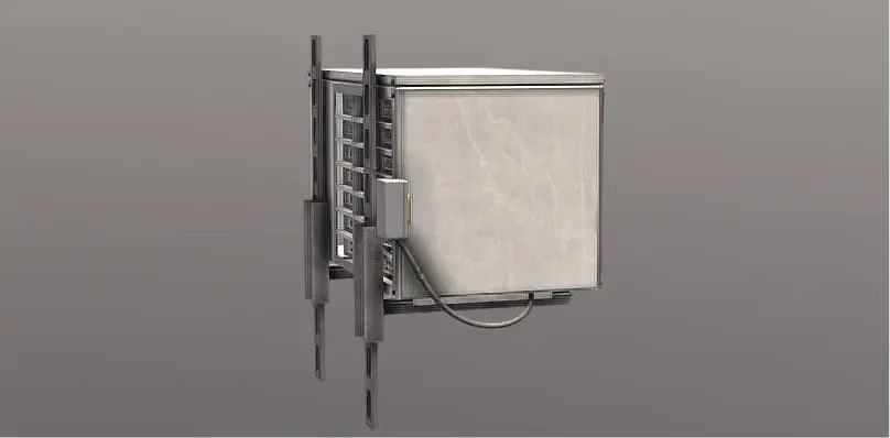 This is a highly detailed and realistic 3D model of an industrial wall-mounted air conditioning (AC) outdoor unit, complete with vent fins, a protective fan grill, electrical wiring, mounting brackets, and a control box with emergency power switch. The model is built with PBR textures for realistic reflections and surface wear, capturing the aged metallic look typically seen in commercial and industrial environments.