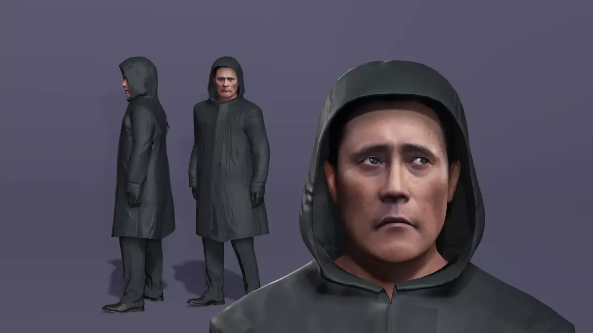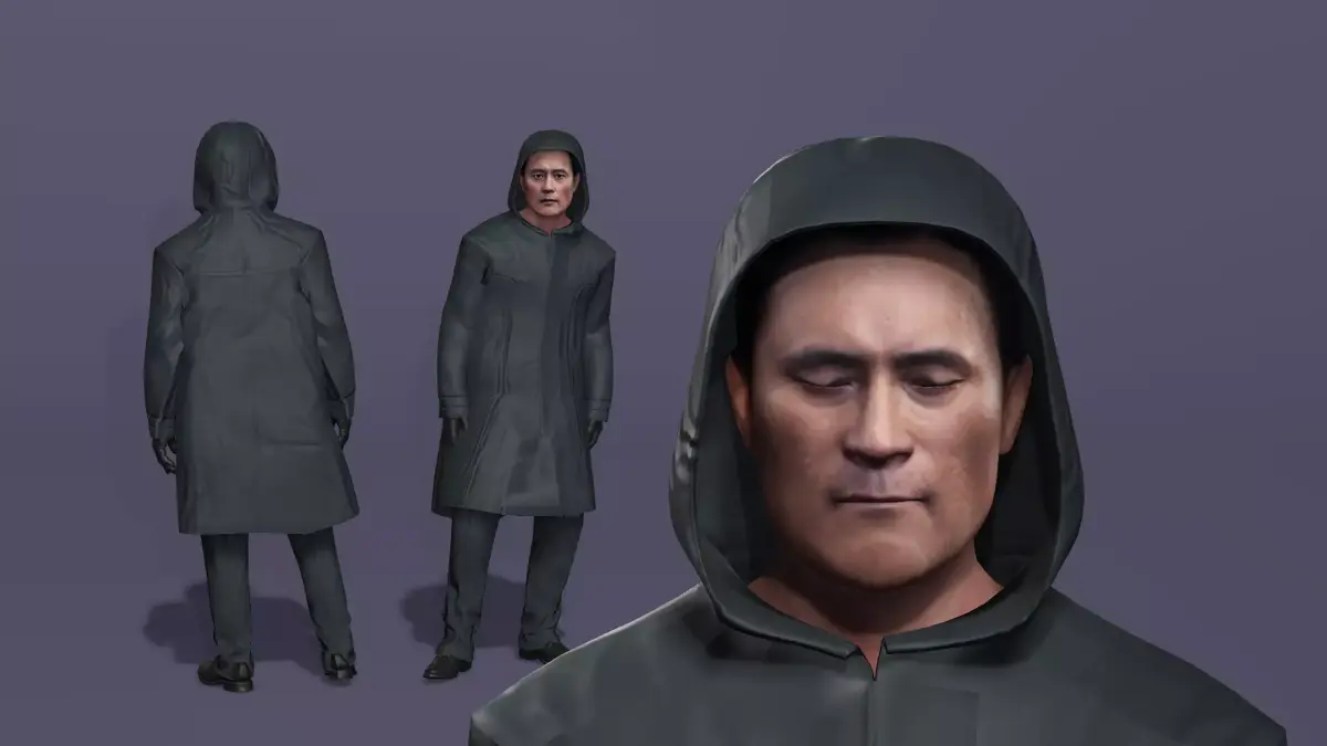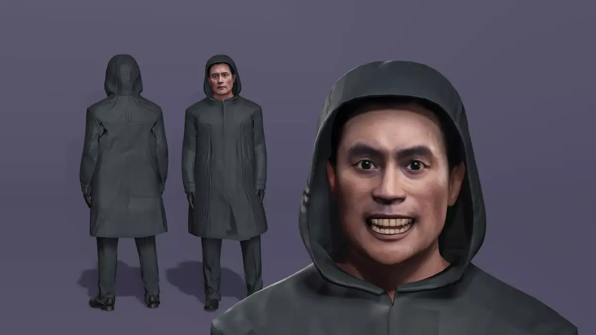 这是一款写实风格的李秉宪3D模型,高度还原他在全球爆款剧集《鱿鱼游戏》中饰演的神秘Boss风衣造型。